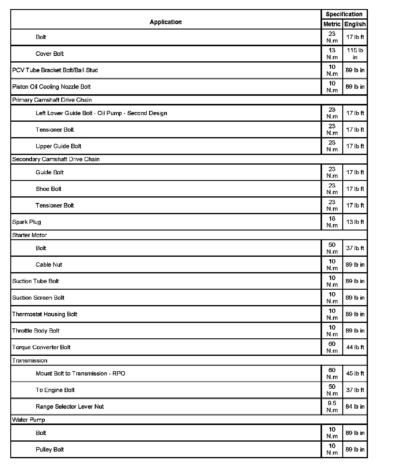 Fastener Tightening Specifications