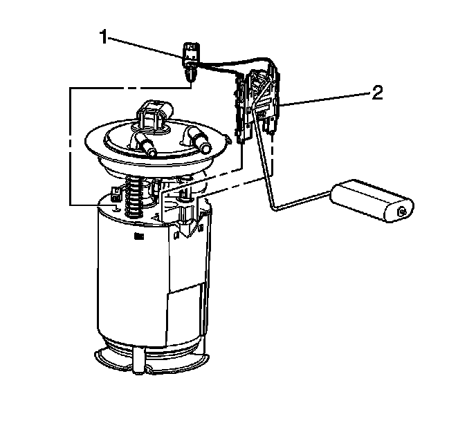 4. Remove the fuel level sensor electrical connector (1) and sensor (2) from the fuel sender assembly.