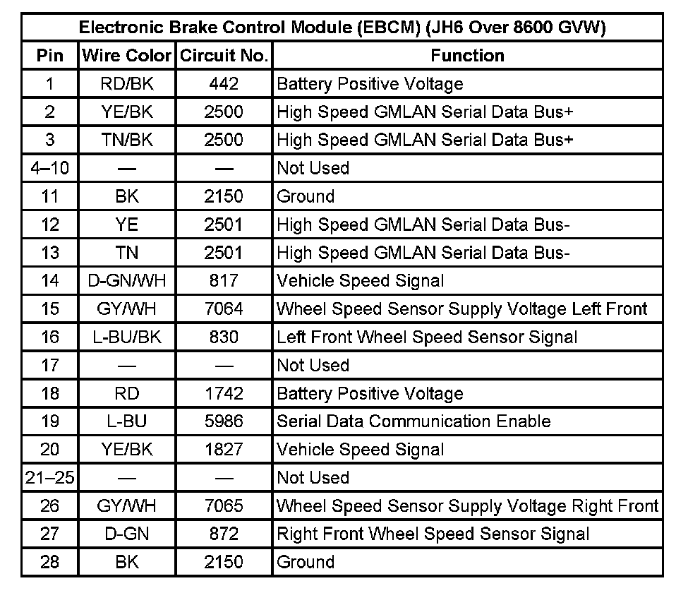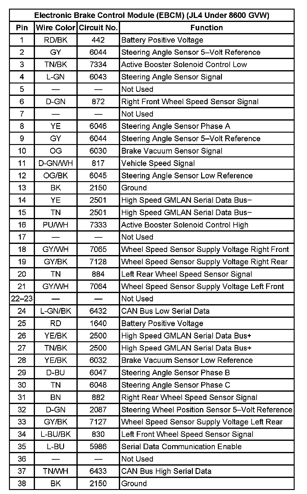 Antilock Brake System Connector End ViewsElectronic Brake Control Module (EBCM) (JL4 Under 8600 GVW):