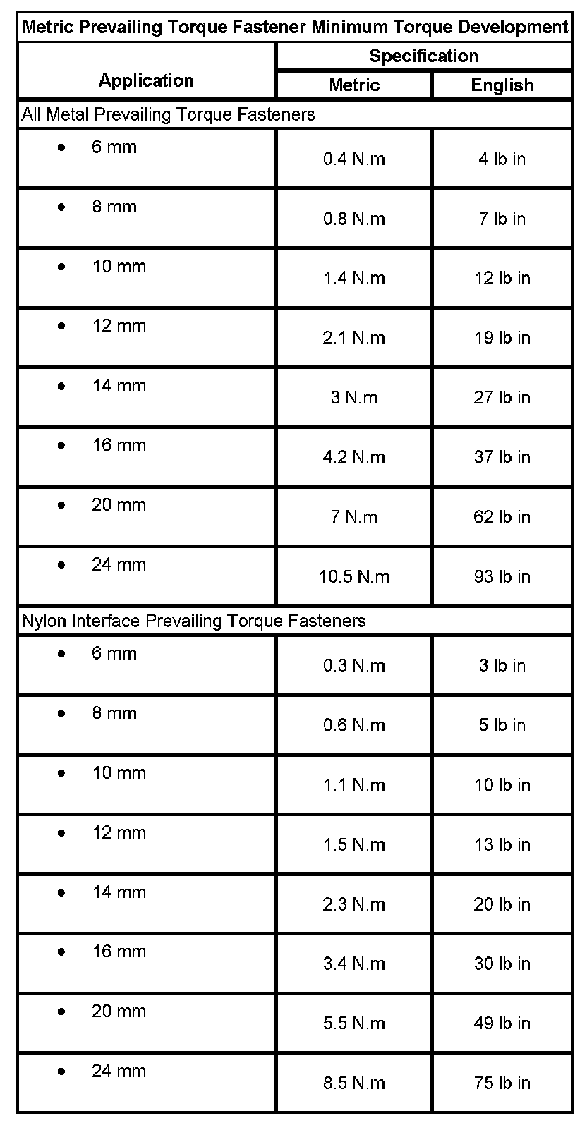 Metric Prevailing Torque Fastener Minimum Torque Development: