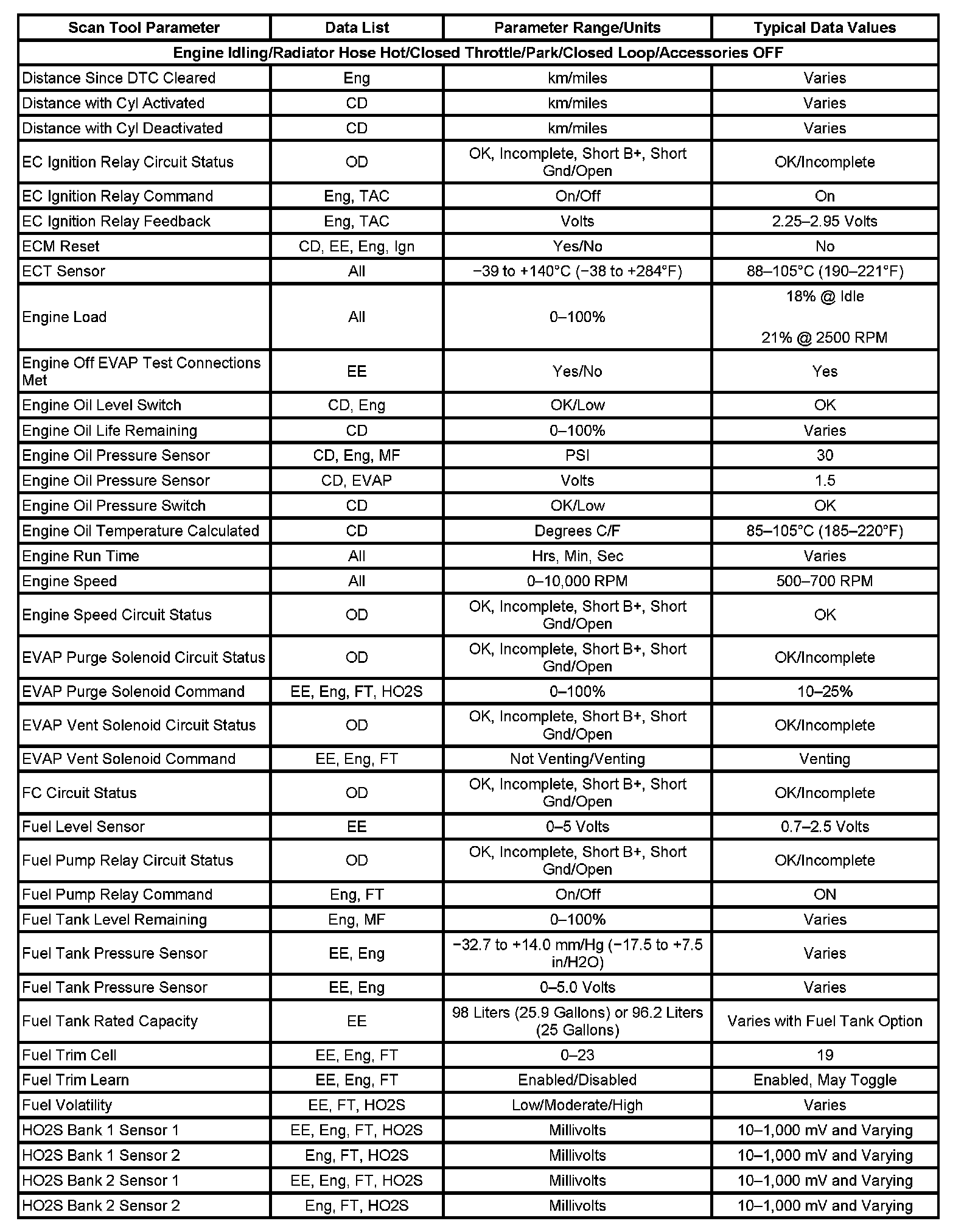 Scan tool values from a properly running engine may be used for comparison with the engine you are diagnosing. The Engine Scan Tool Data List represents values that would be seen on a normal running engine at idle.