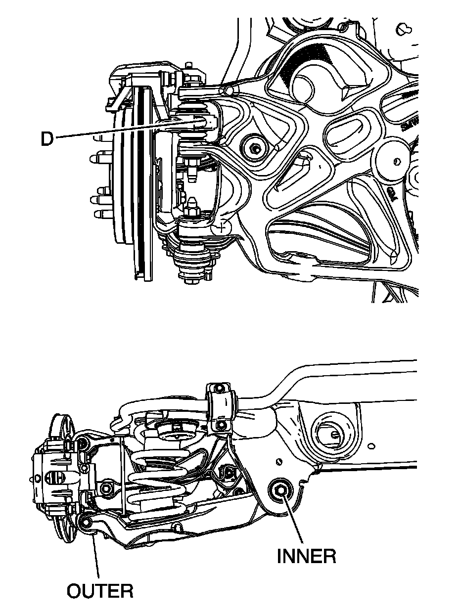 5. Measure from the D outer on the knuckle to the center of the lower control arm bolt Inner.