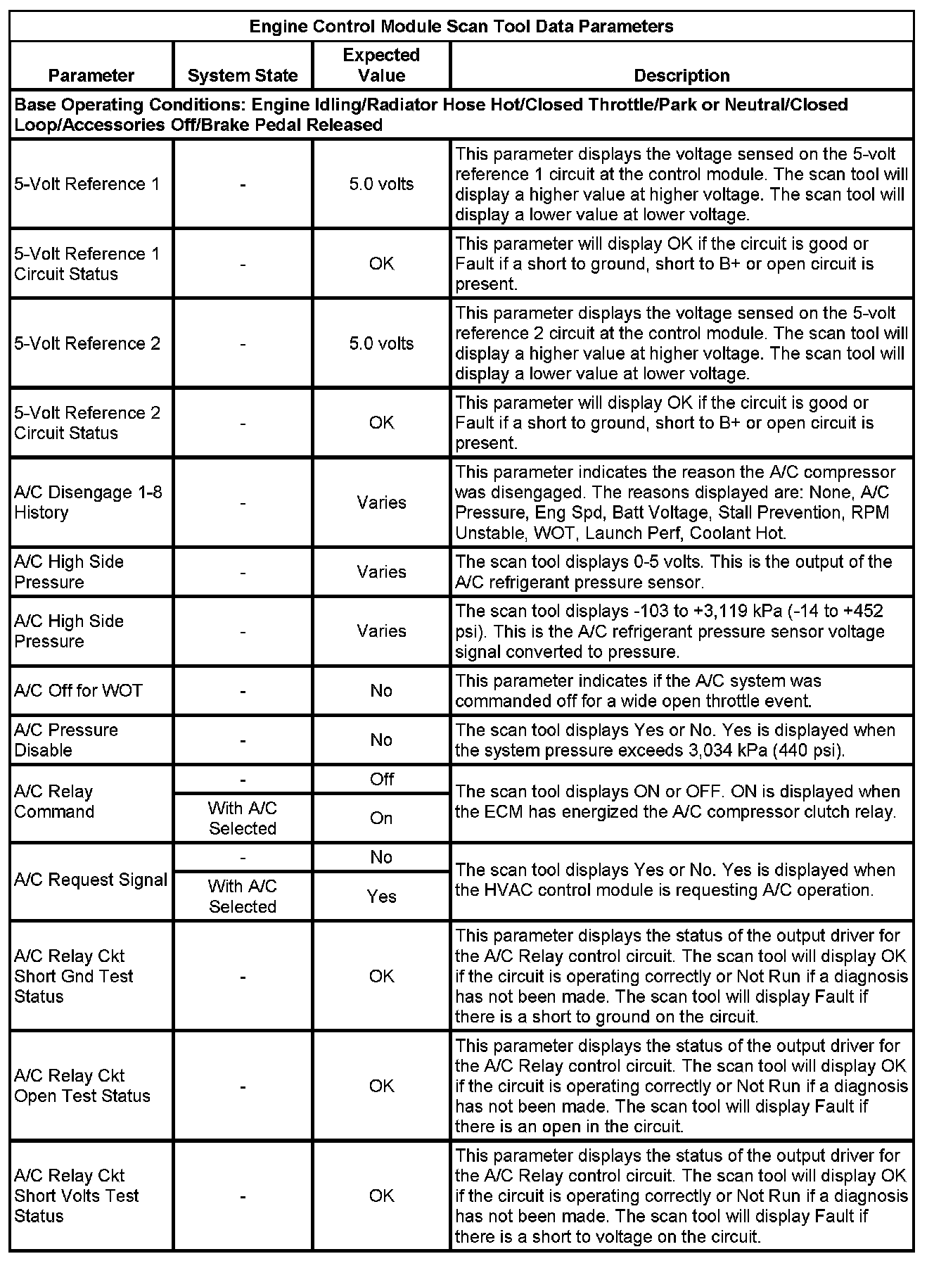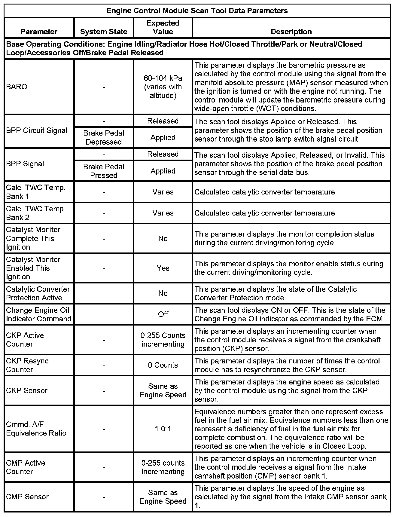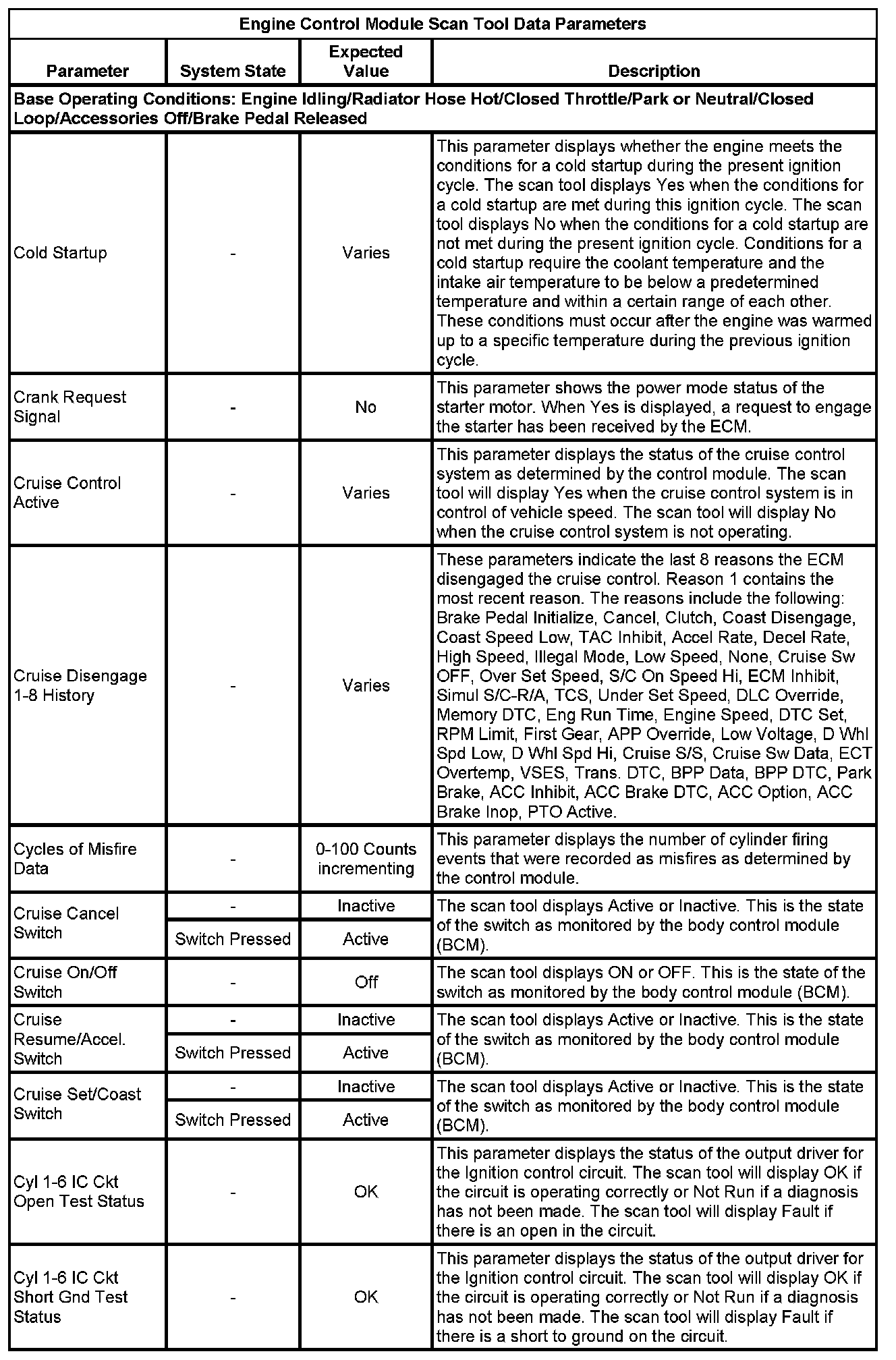 The Engine Control Module Scan Tool Data List contains all engine-related parameters that are available on the scan tool. The list is arranged in alphabetical order. A given parameter may appear in any one of the data lists, and in some cases may appear more than once, or in more than one data list in order to group certain related parameters together.