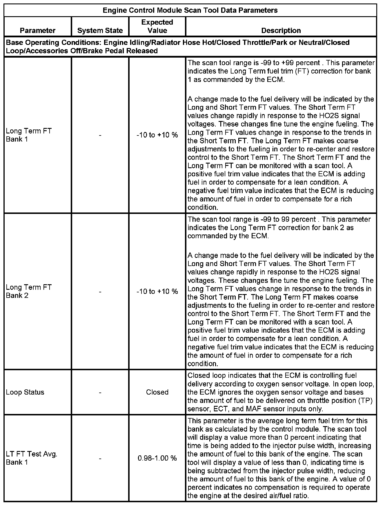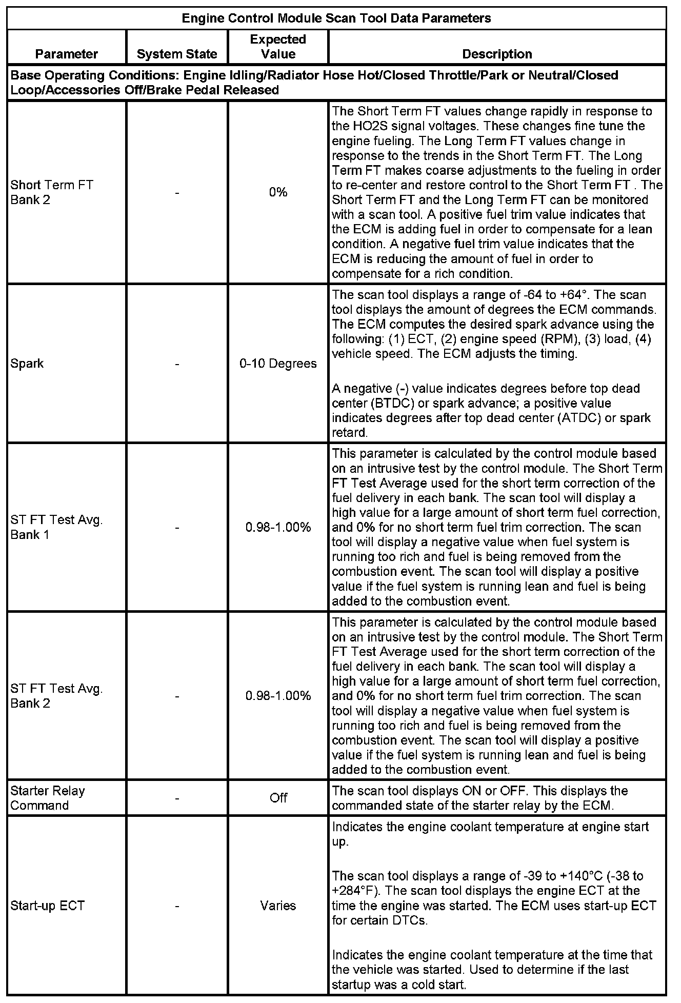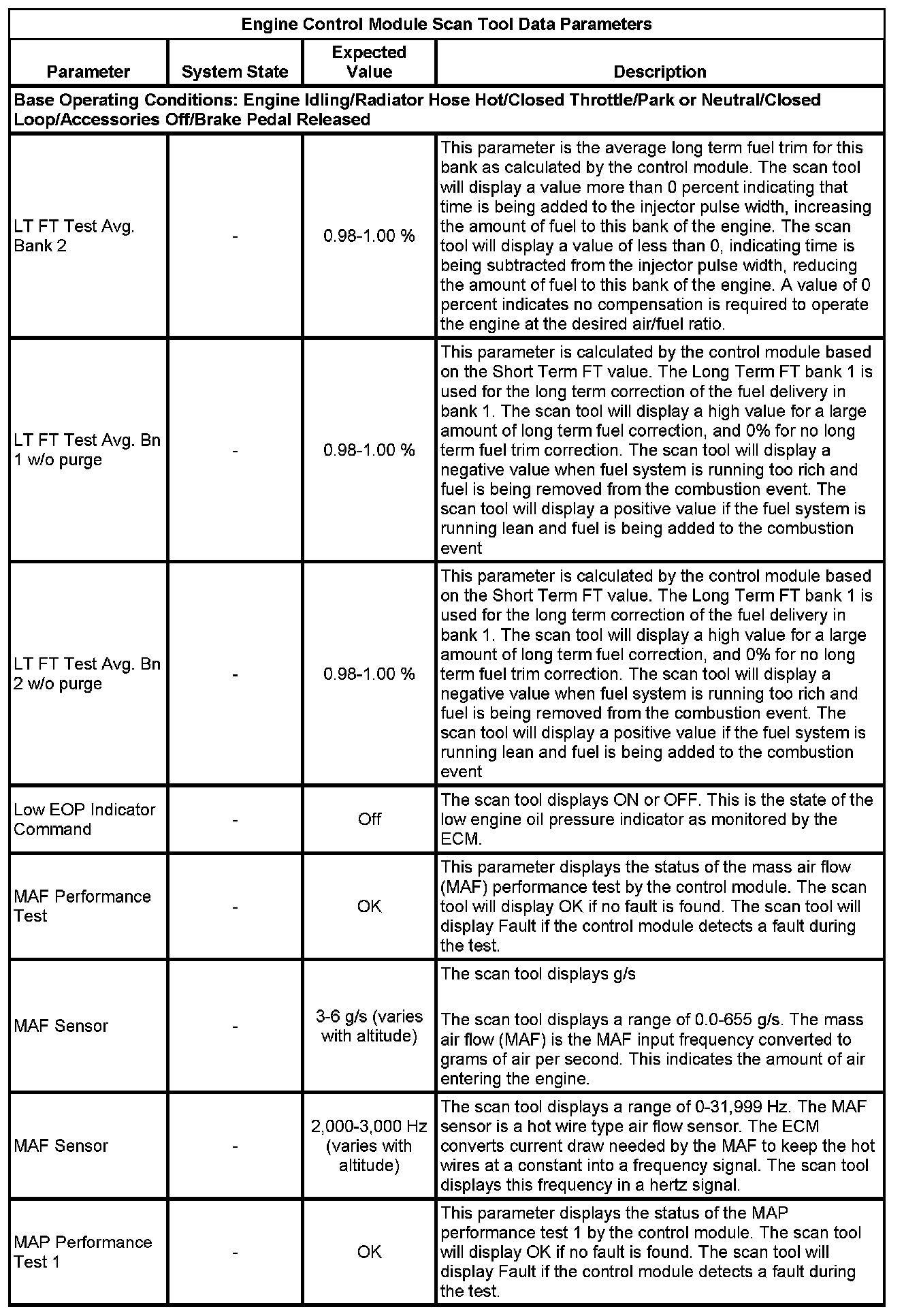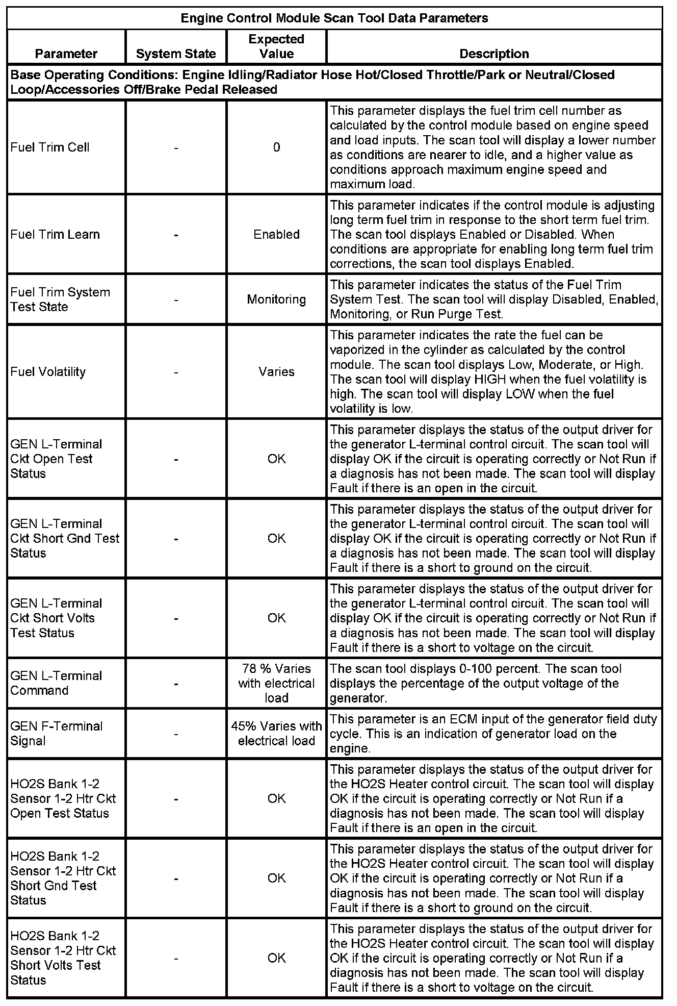 The scan tool values from a properly running engine may be used for comparison with the engine you are diagnosing. The Engine Scan Tool Data List represents values that would be seen on a normally running engine.