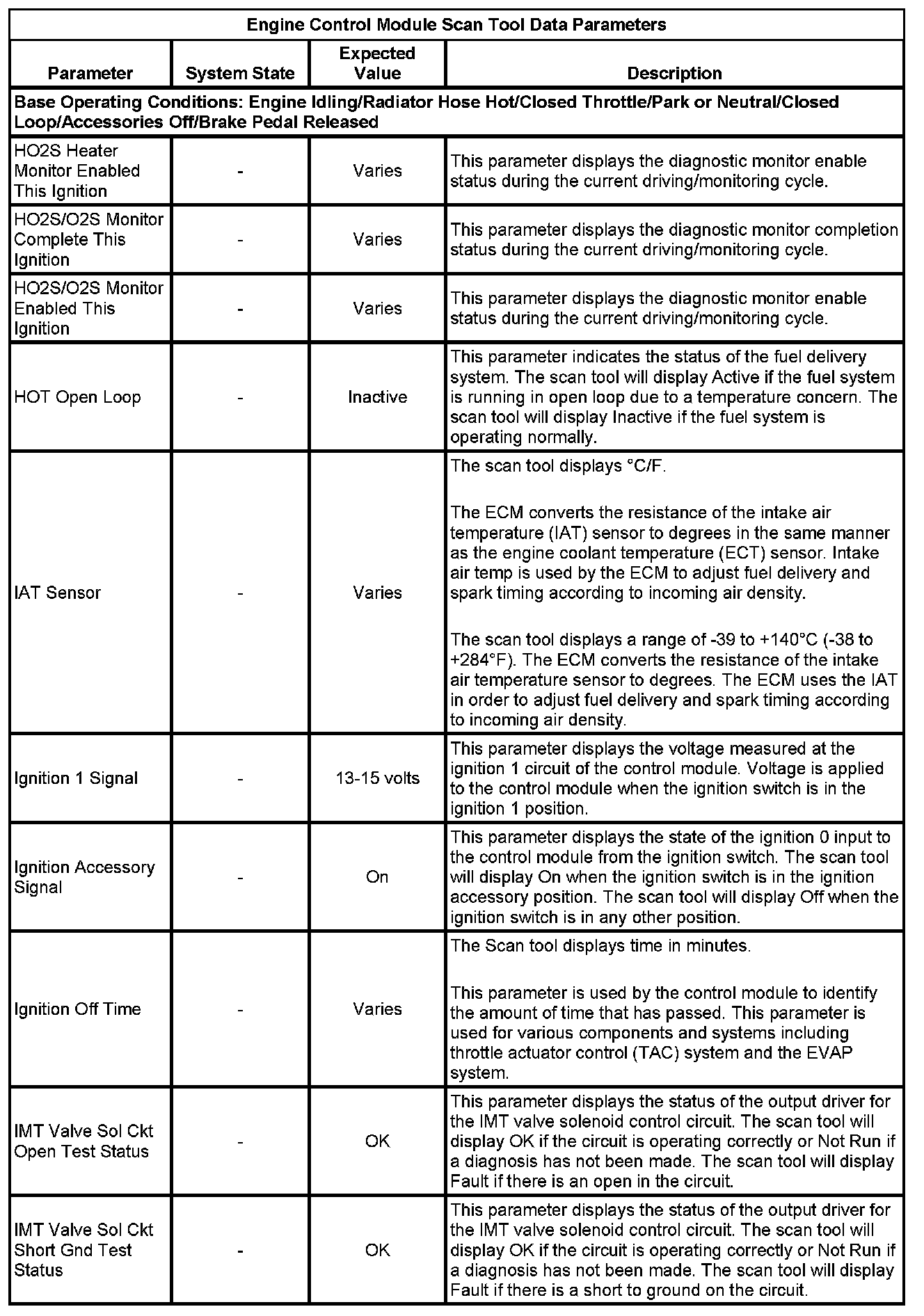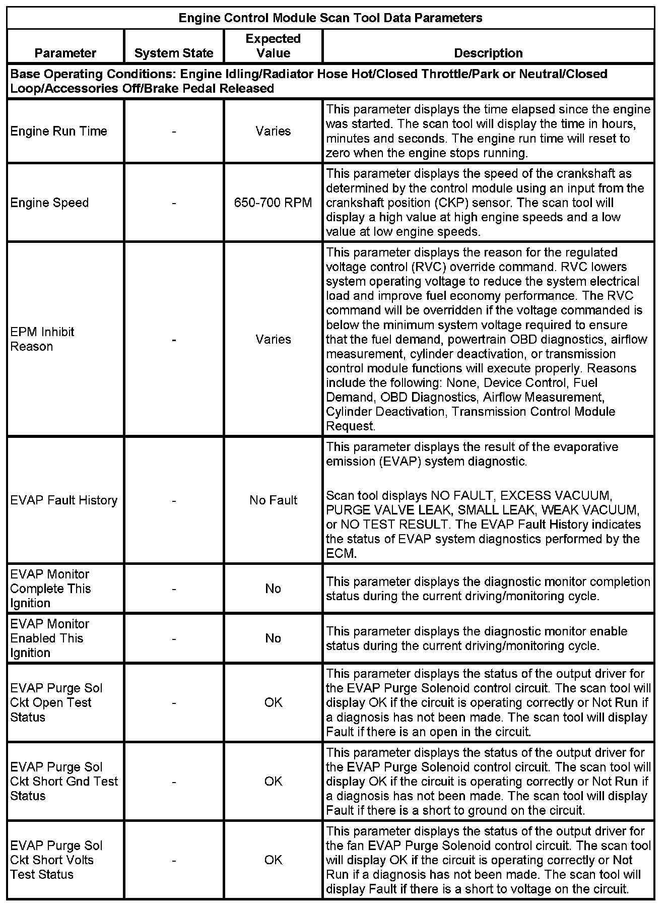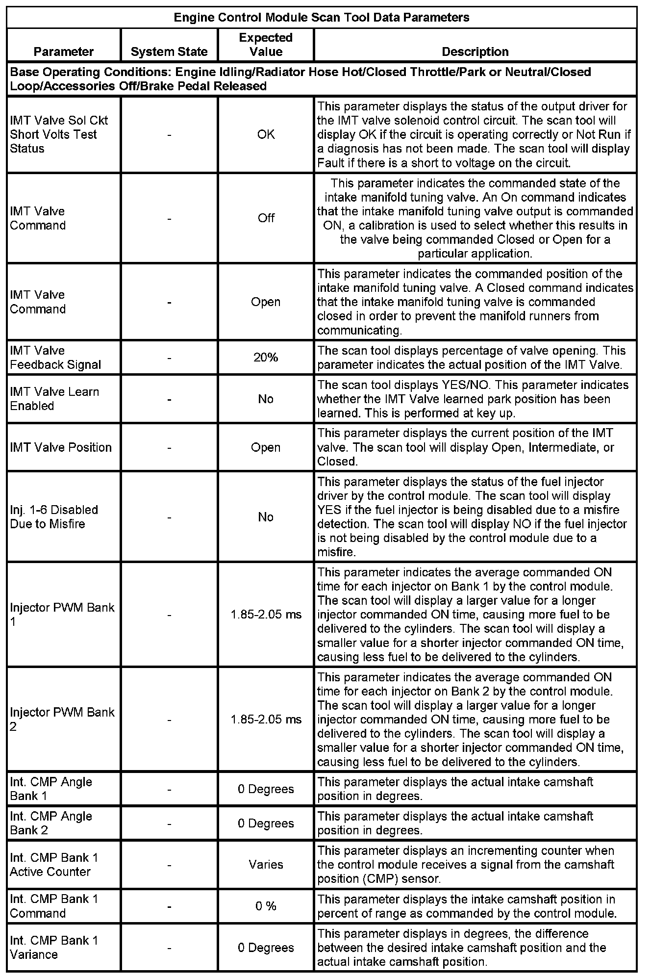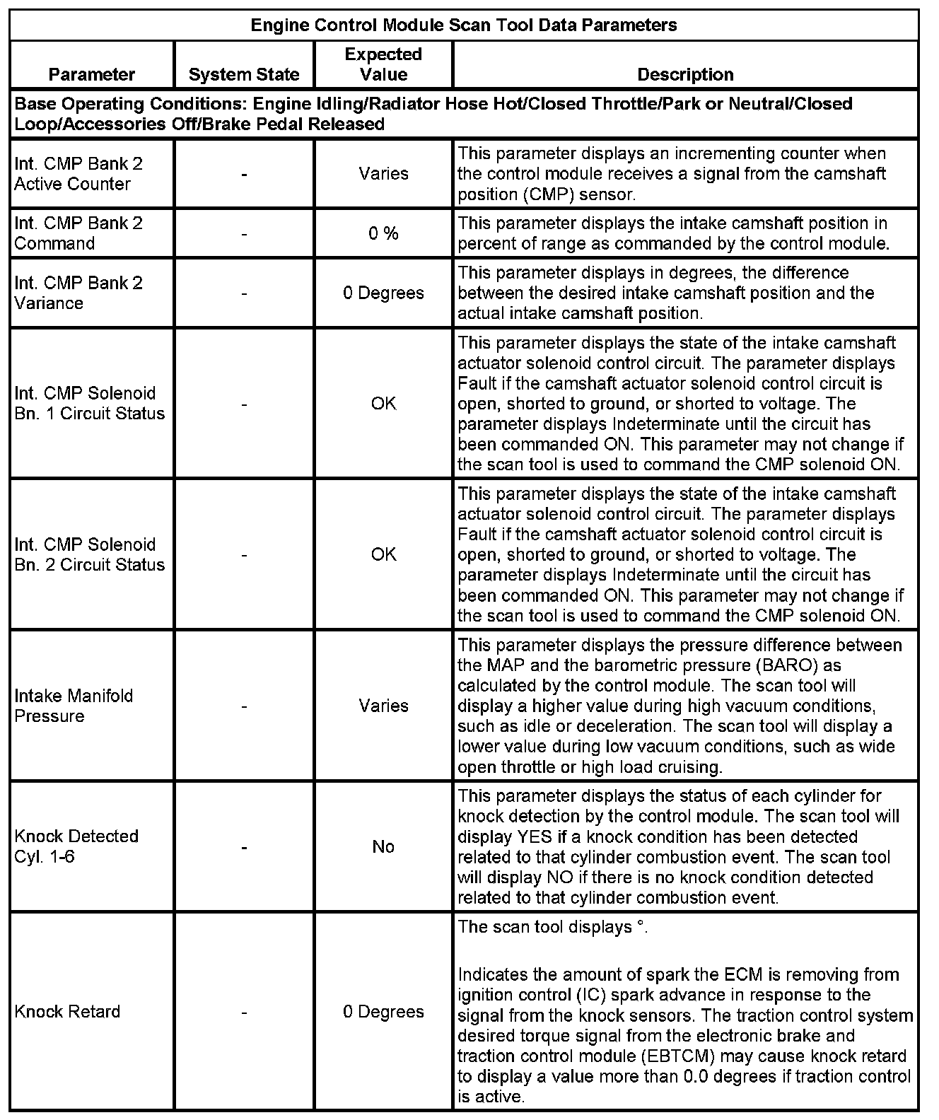 The scan tool values from a properly running engine may be used for comparison with the engine you are diagnosing. The Engine Scan Tool Data List represents values that would be seen on a normally running engine.