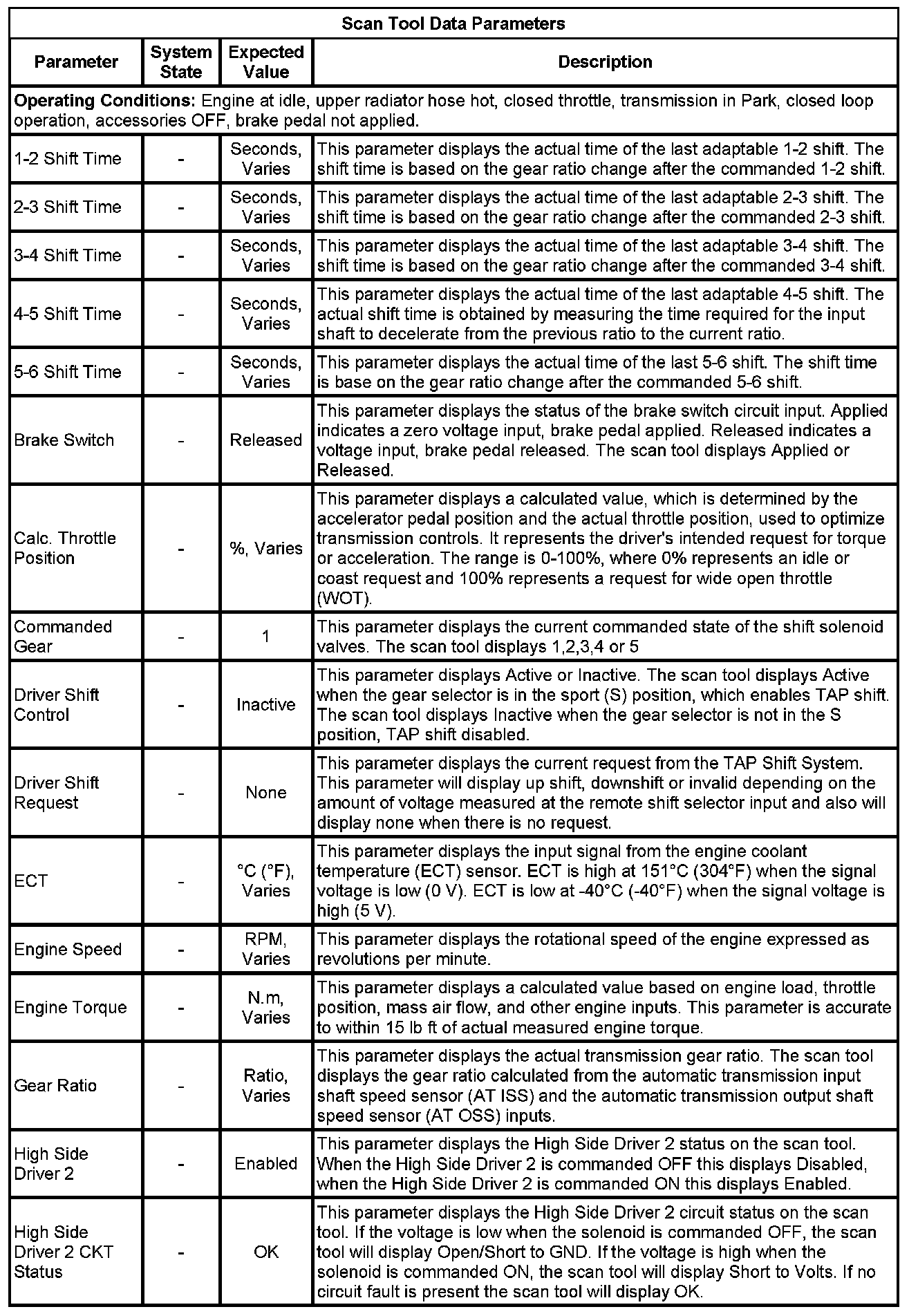 If all values are within the expected range described below, refer to Symptoms - Automatic Transmission for diagnosis. Symptom Related Diagnostic Procedures