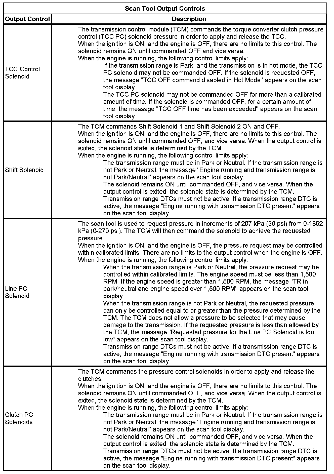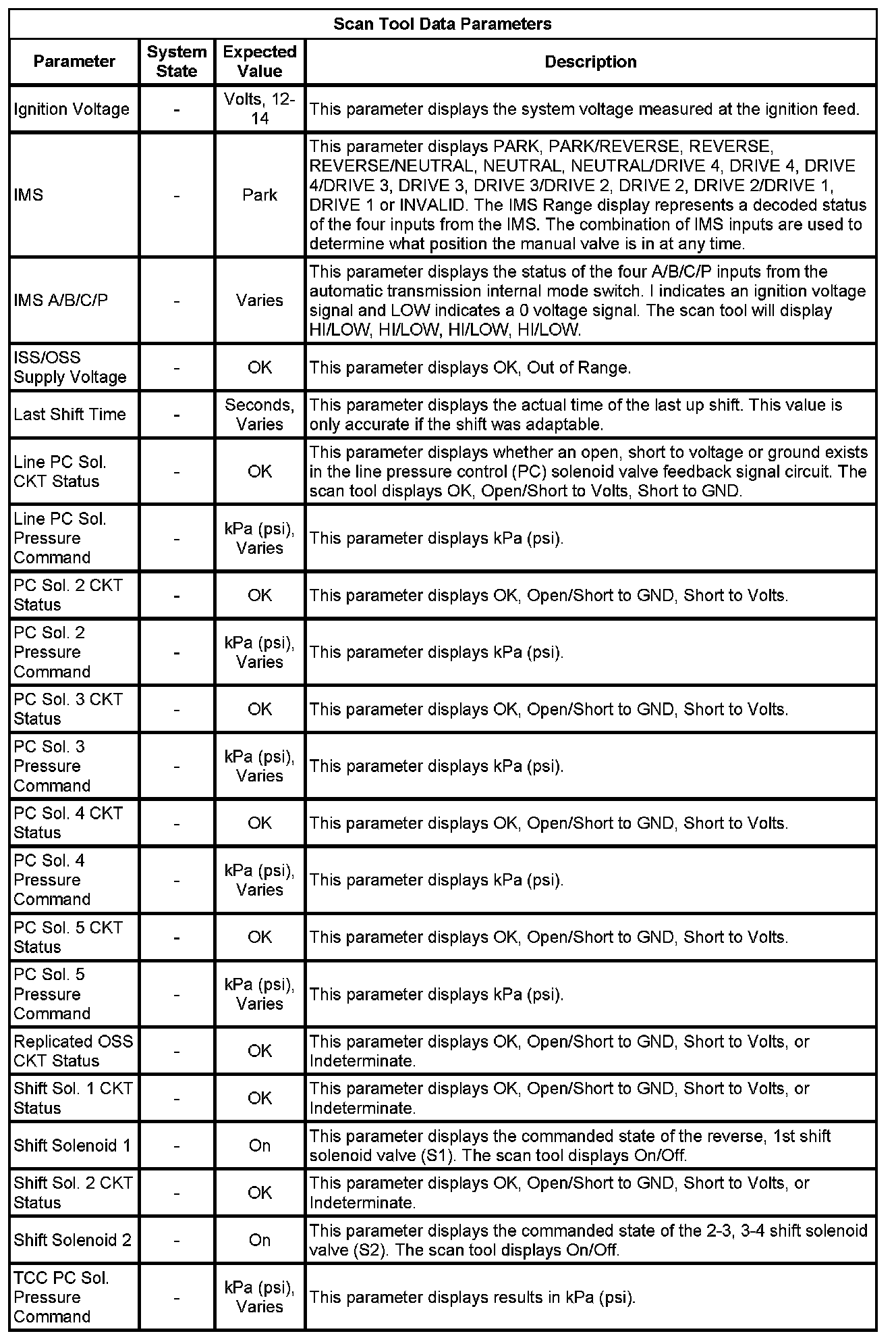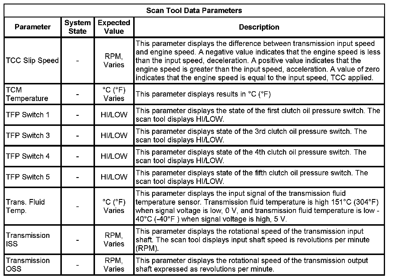 The Transmission Control Module Scan Tool Data List contains all transmission related parameters that are available on the scan tool. The list is arranged in alphabetical order. A given parameter may appear in any one of the data lists, and in some cases may appear more than once, or in more than one data list in order to group certain related parameters together.