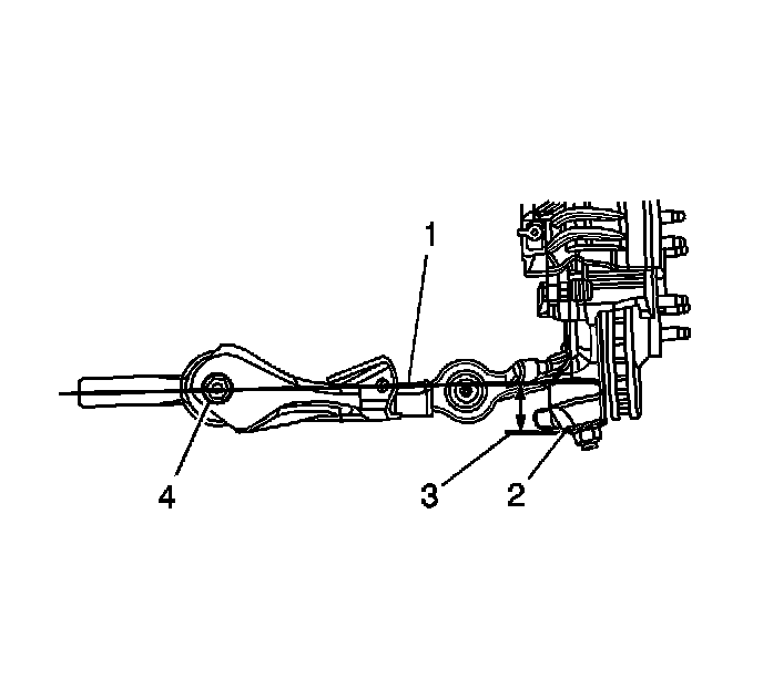 4. Measure and record the distance from the centerline (1) of the lower control arm bushing bolt (4) down to the machined edge of the steering knuckle (2) in order to obtain the Z height specifications.