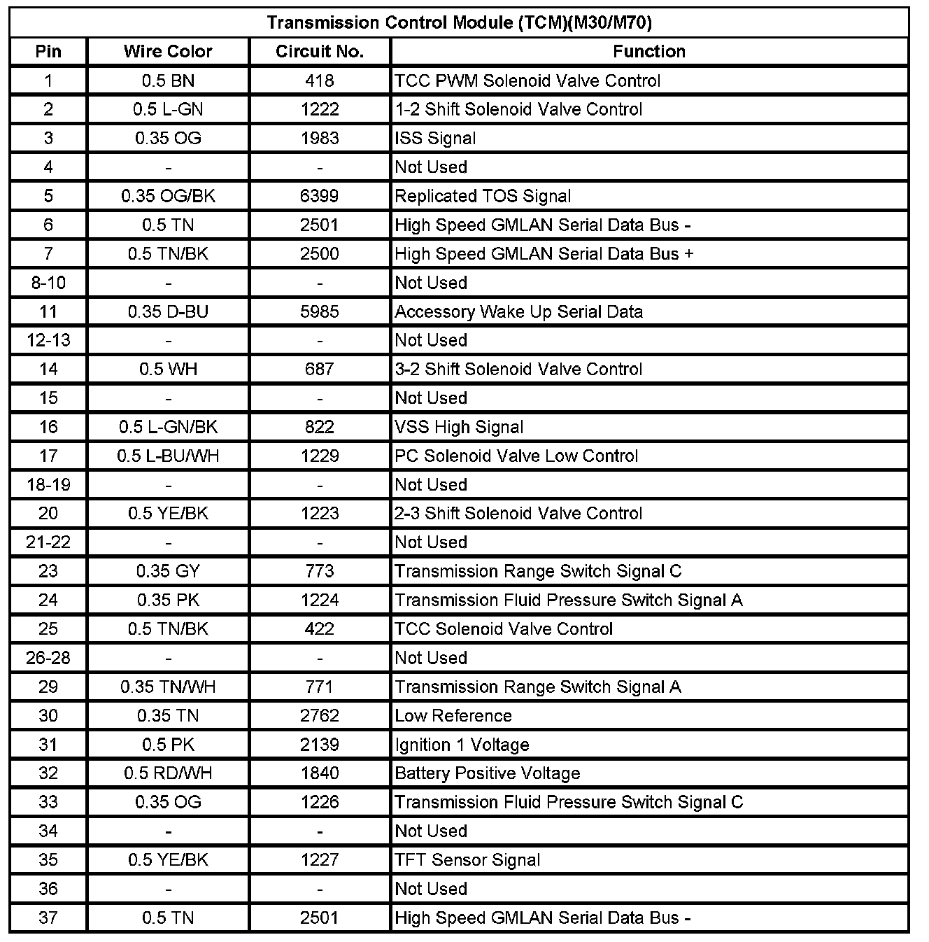 Transmission Control Module (TCM)(M30/M70) (Pin 1 To 37):