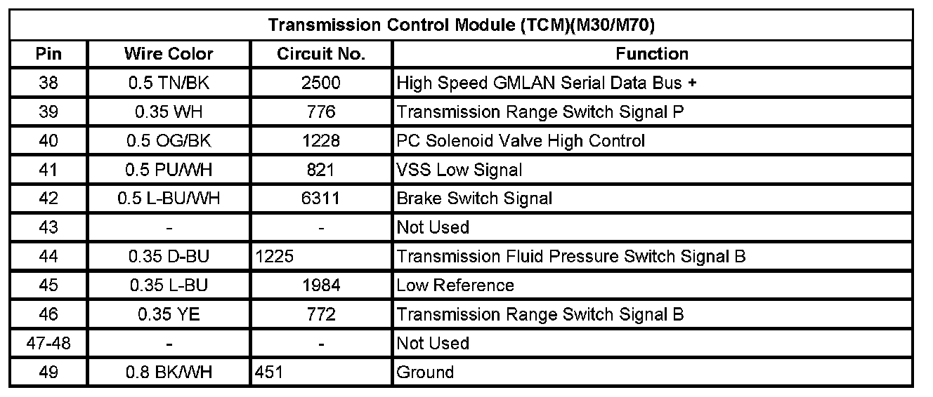 Transmission Control Module (TCM)(M30/M70) (Pin 38 To 49):