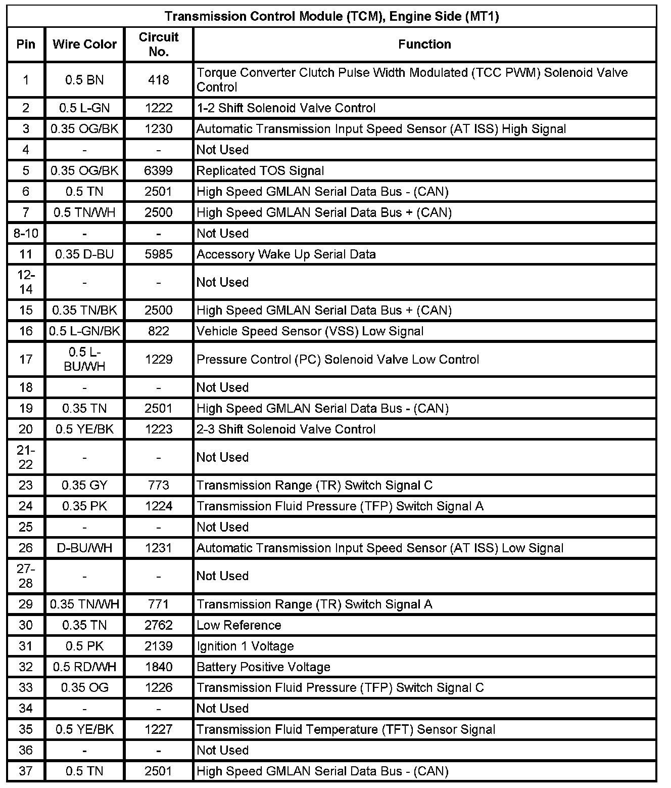 Transmission Control Module (TCM), Engine Side (MT1) (Pin 1 To 37):
