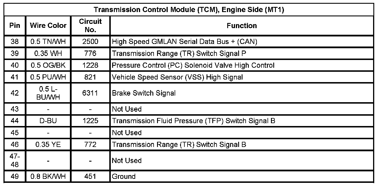 Transmission Control Module (TCM), Engine Side (MT1) (Pin 38 To 49):