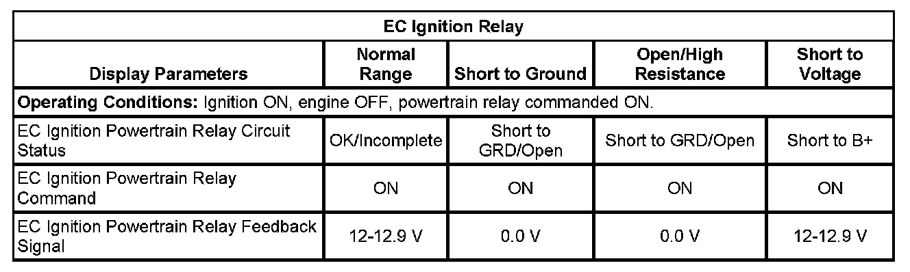 12. Ignition ON, engine OFF, monitor the EC Ignition Relay Feedback parameter with a scan tool. The parameter should display B+.