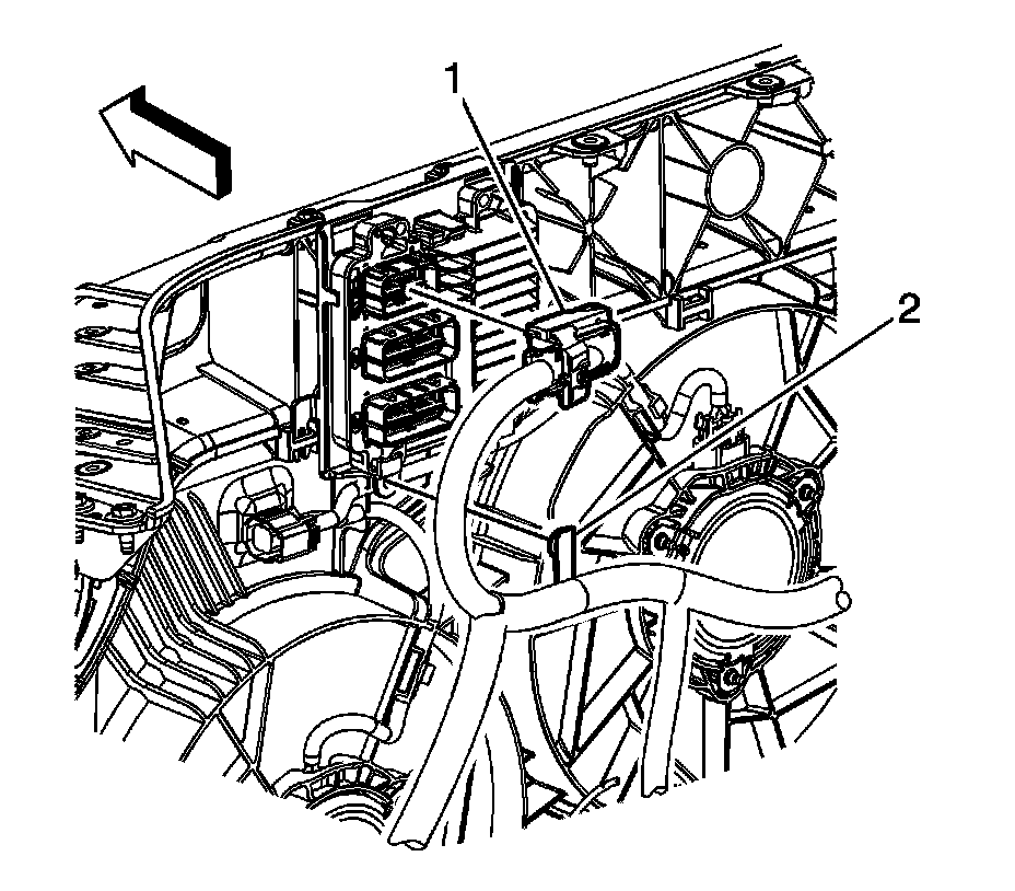 5. If also replacing the ECM bracket, remove the engine wiring harness clip (2) from the ECM bracket tab.