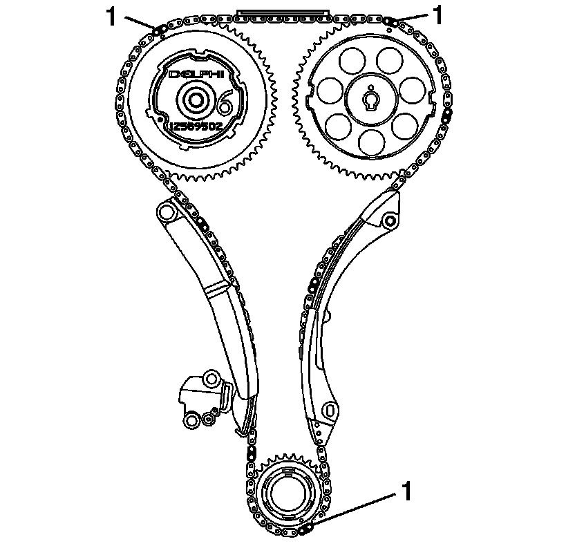 The dark lines (1) on the chain should be aligned with the marks on the sprockets as shown.