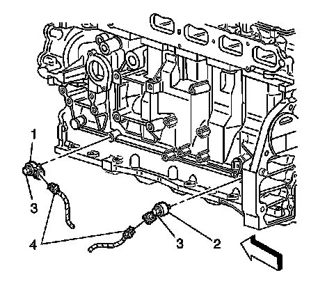 1. Install the knock sensor (1 or 2) and the bolt (3). Tighten the sensor to 25 Nm (18 lb ft).