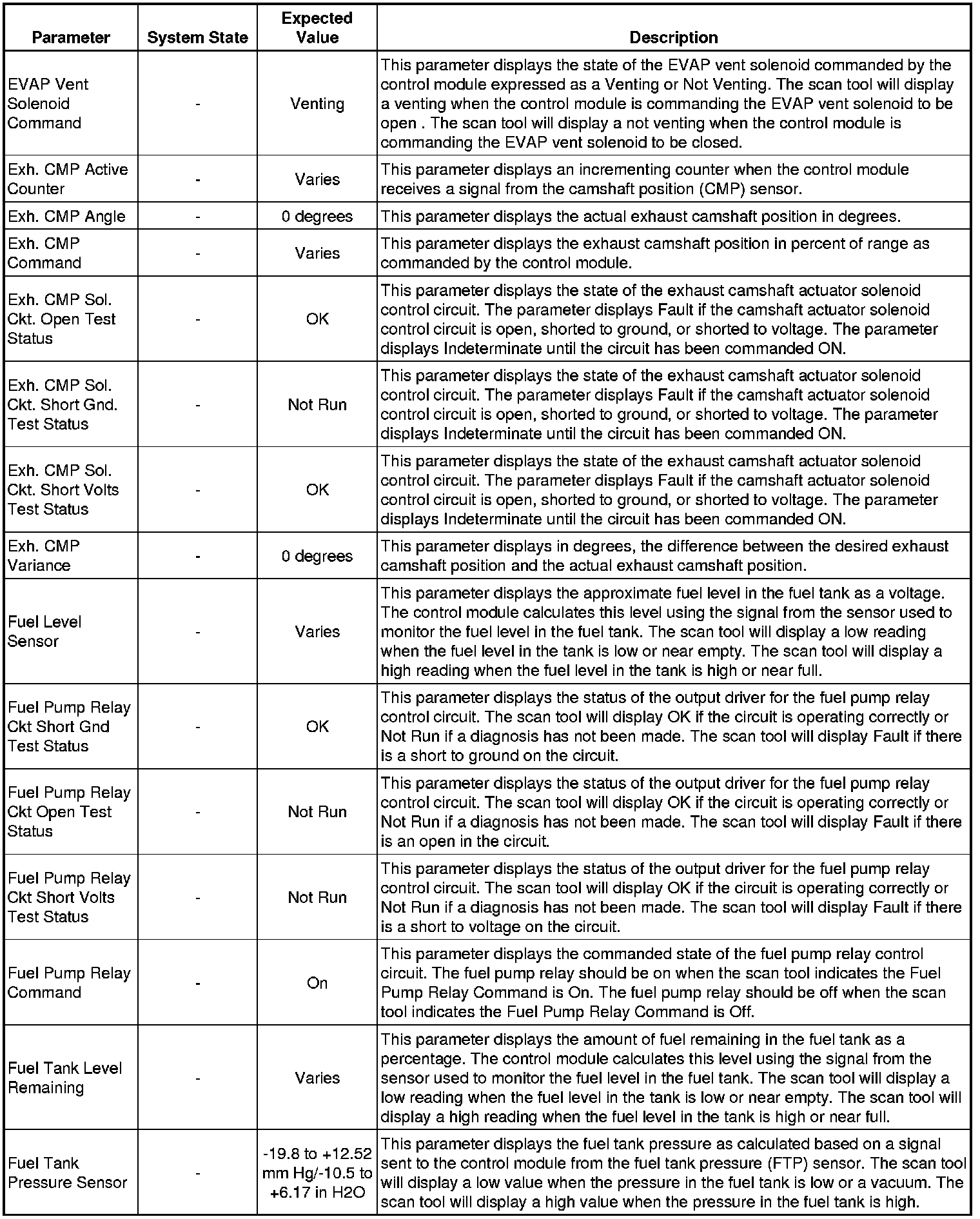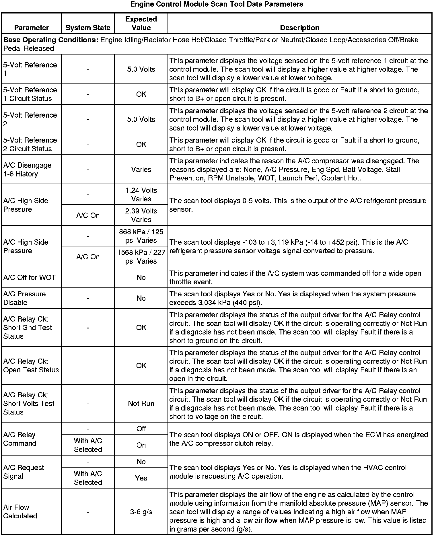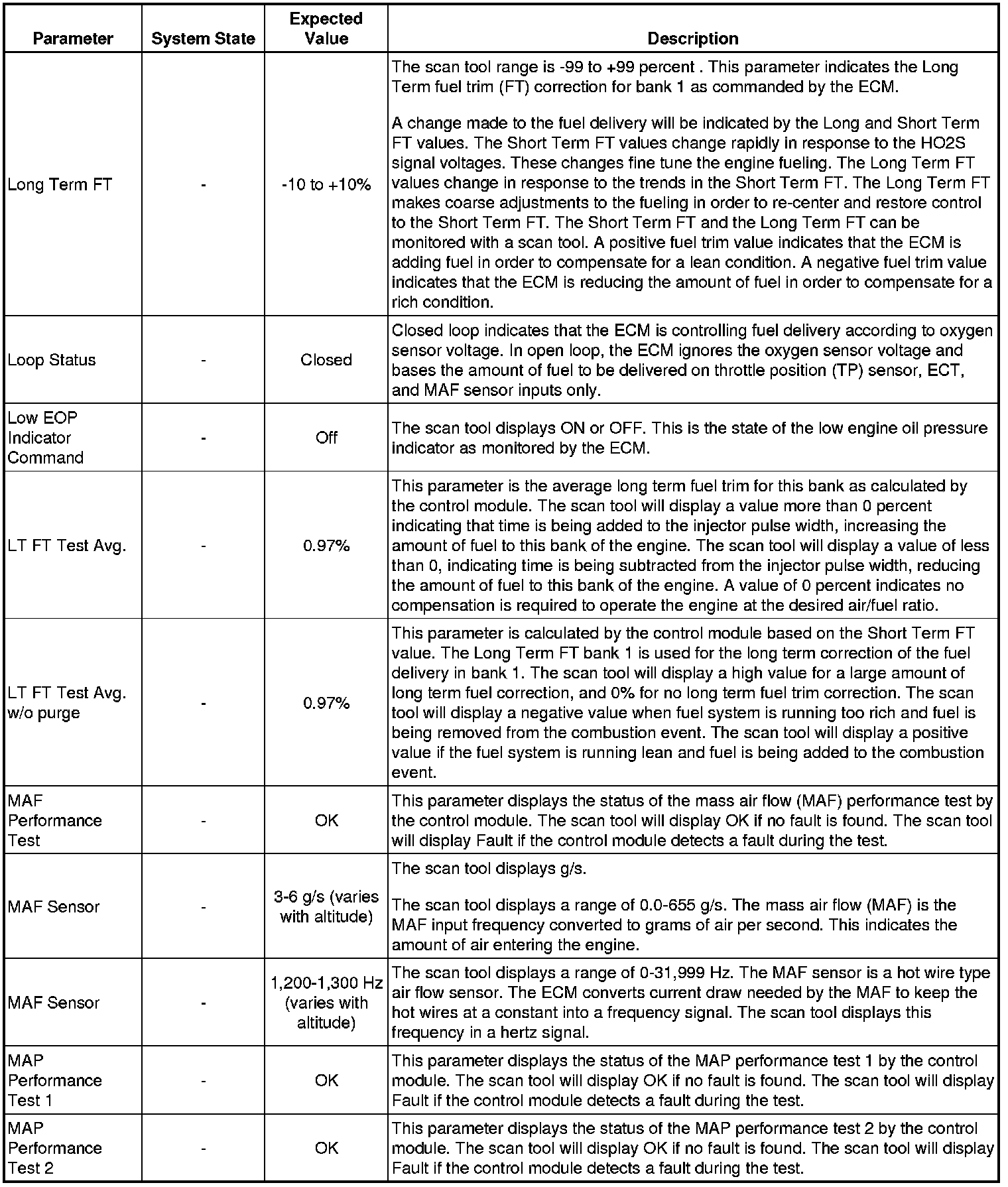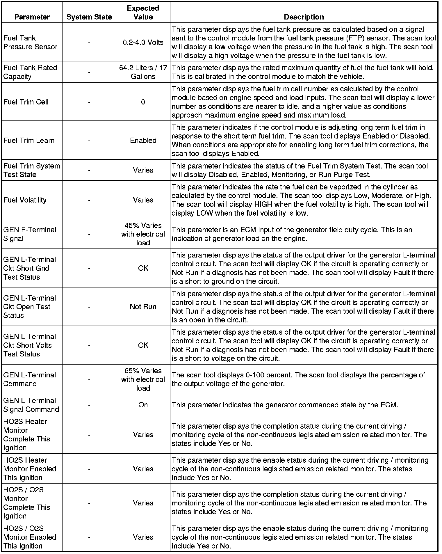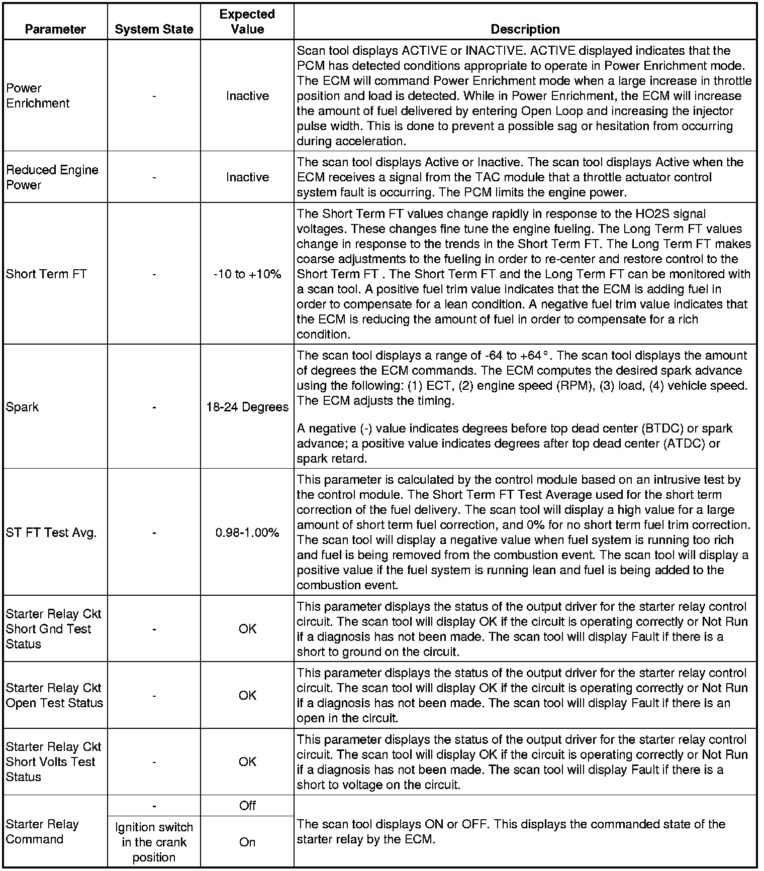 The Engine Control Module Scan Tool Data List contains all engine-related parameters that are available on the scan tool. The list is arranged in alphabetical order. A given parameter may appear in any one of the data lists, and in some cases may appear more than once, or in more than one data list in order to group certain related parameters together.