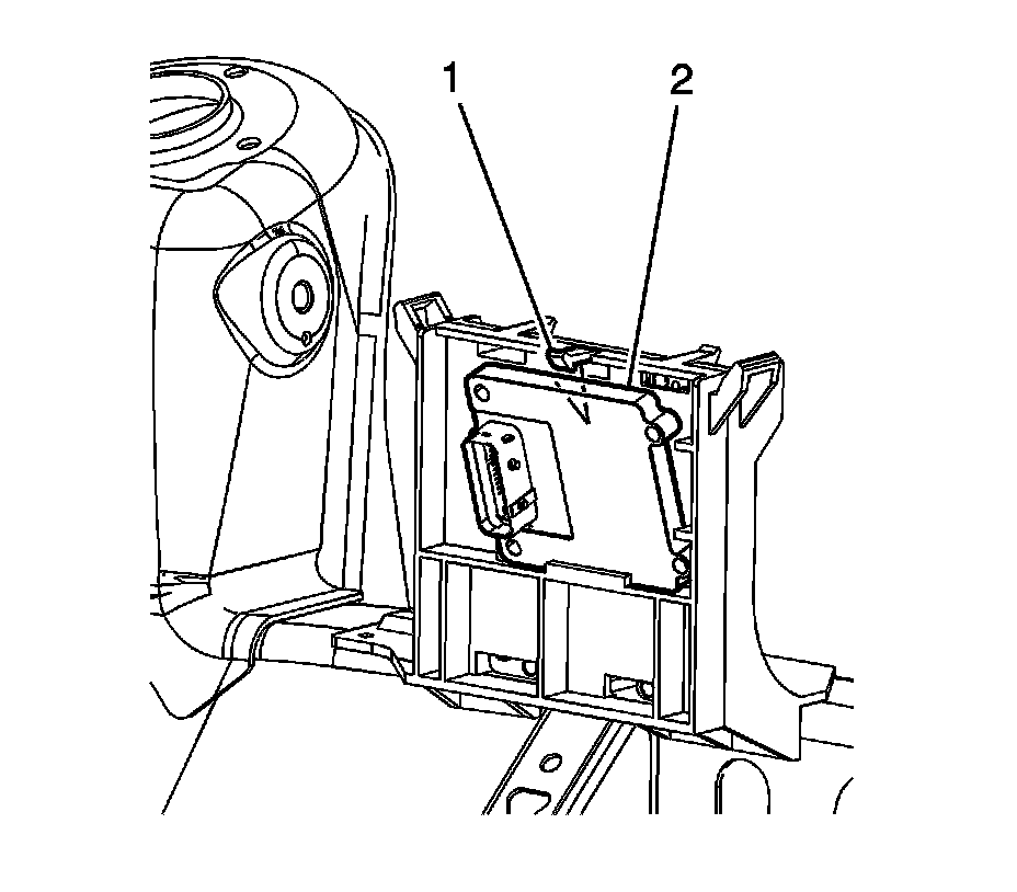6. Secure the TCM (2) to the ECM/TCM mounting bracket ensuring the TCM retaining tab (1) is fully engaged.