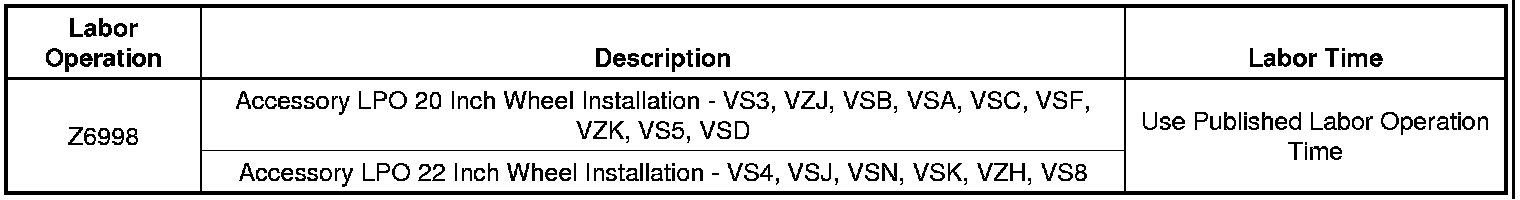 The following RPO codes designate the 20 inch or 22 inch accessory wheel that will be installed by the dealer: VSA, VSB, VSC, VSF, VS3, VZJ, VZK, VS5, VS4, VSJ, VSK, VZH, VSN, VS8.