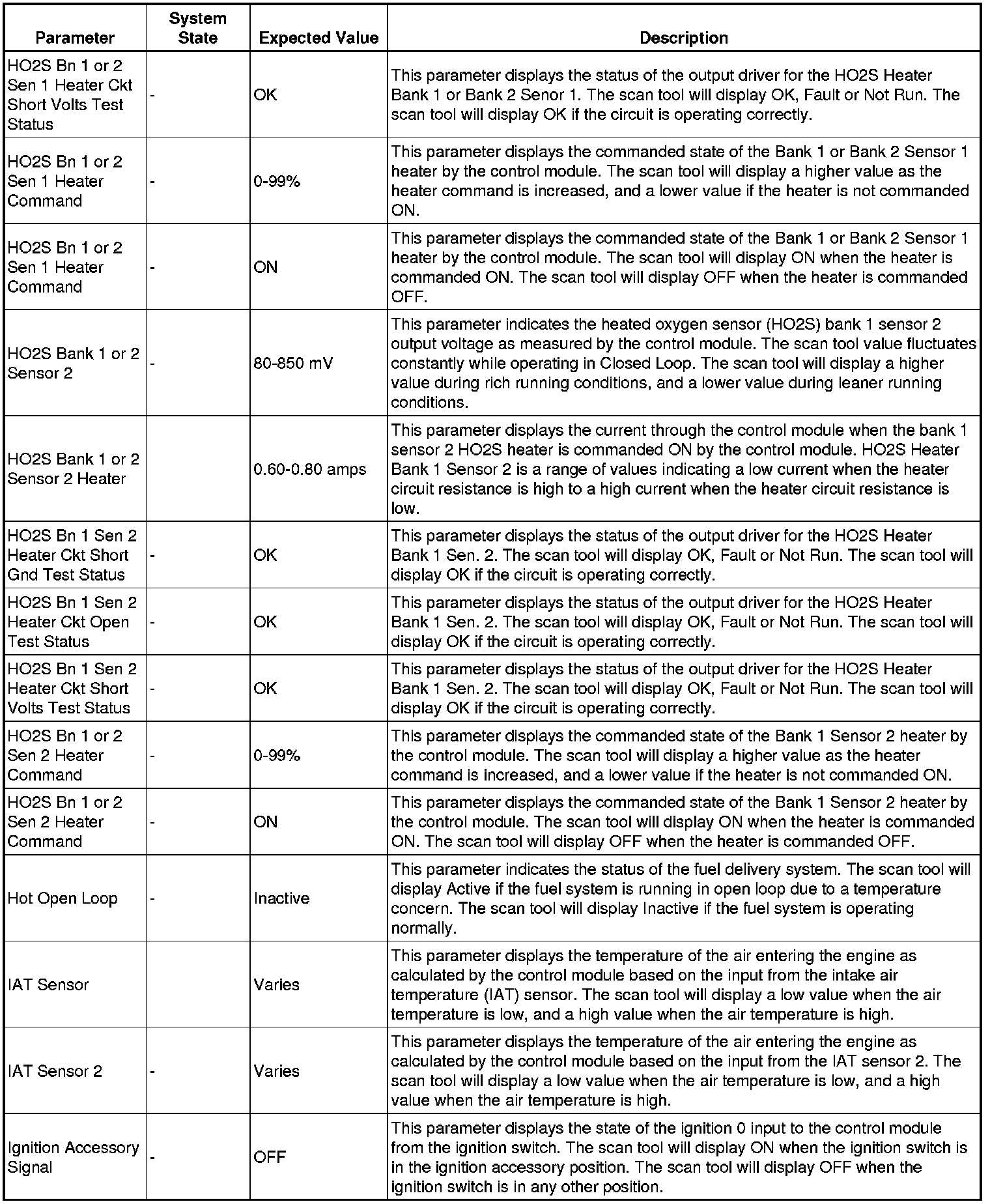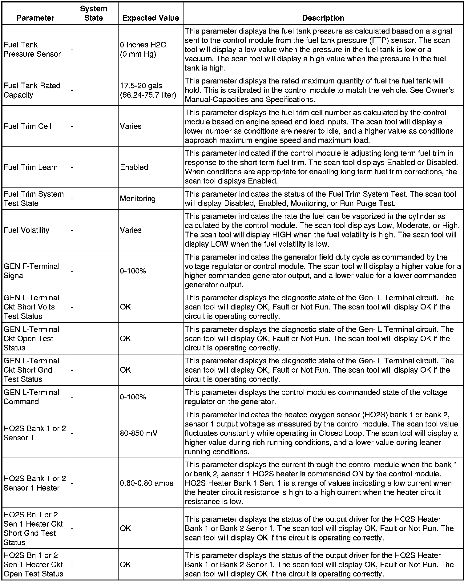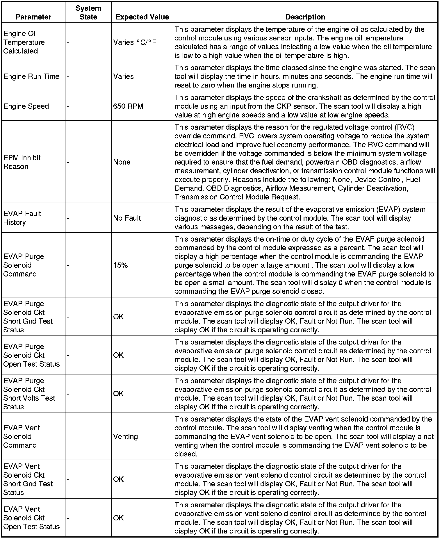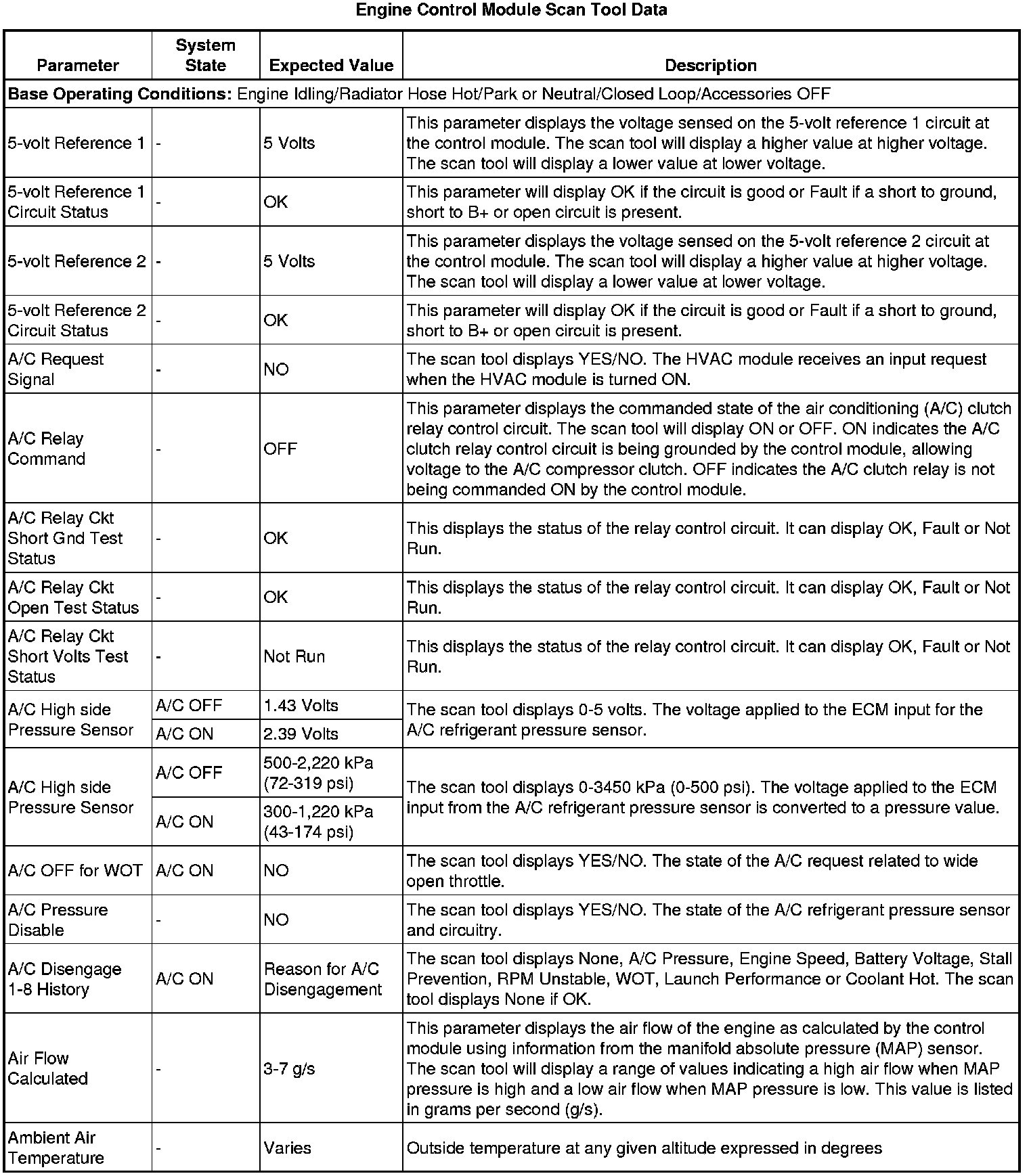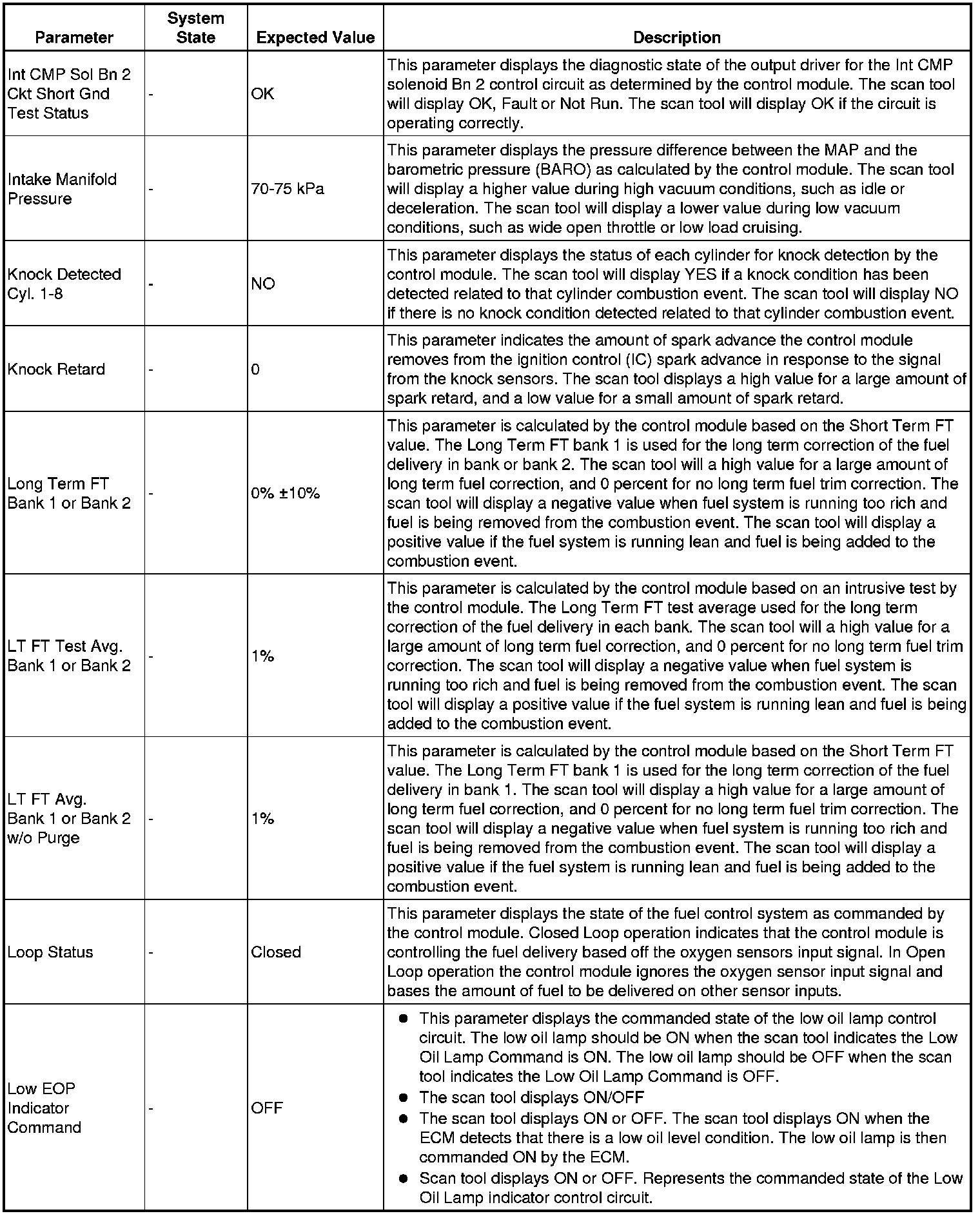 The scan tool values from a properly running engine may be used for comparison with the engine you are diagnosing. The engine scan tool data list represents values that would be seen on a normally running engine.