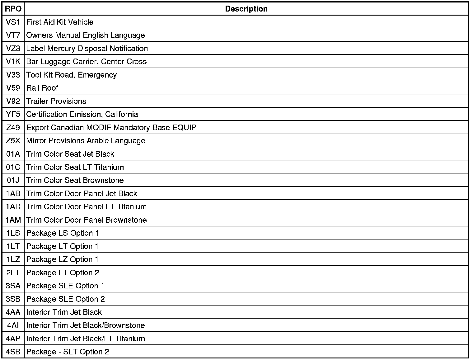The following table provides the description of the RPO codes that are available on the vehicle. The vehicles RPO list is printed on the Service Parts Identification Label.