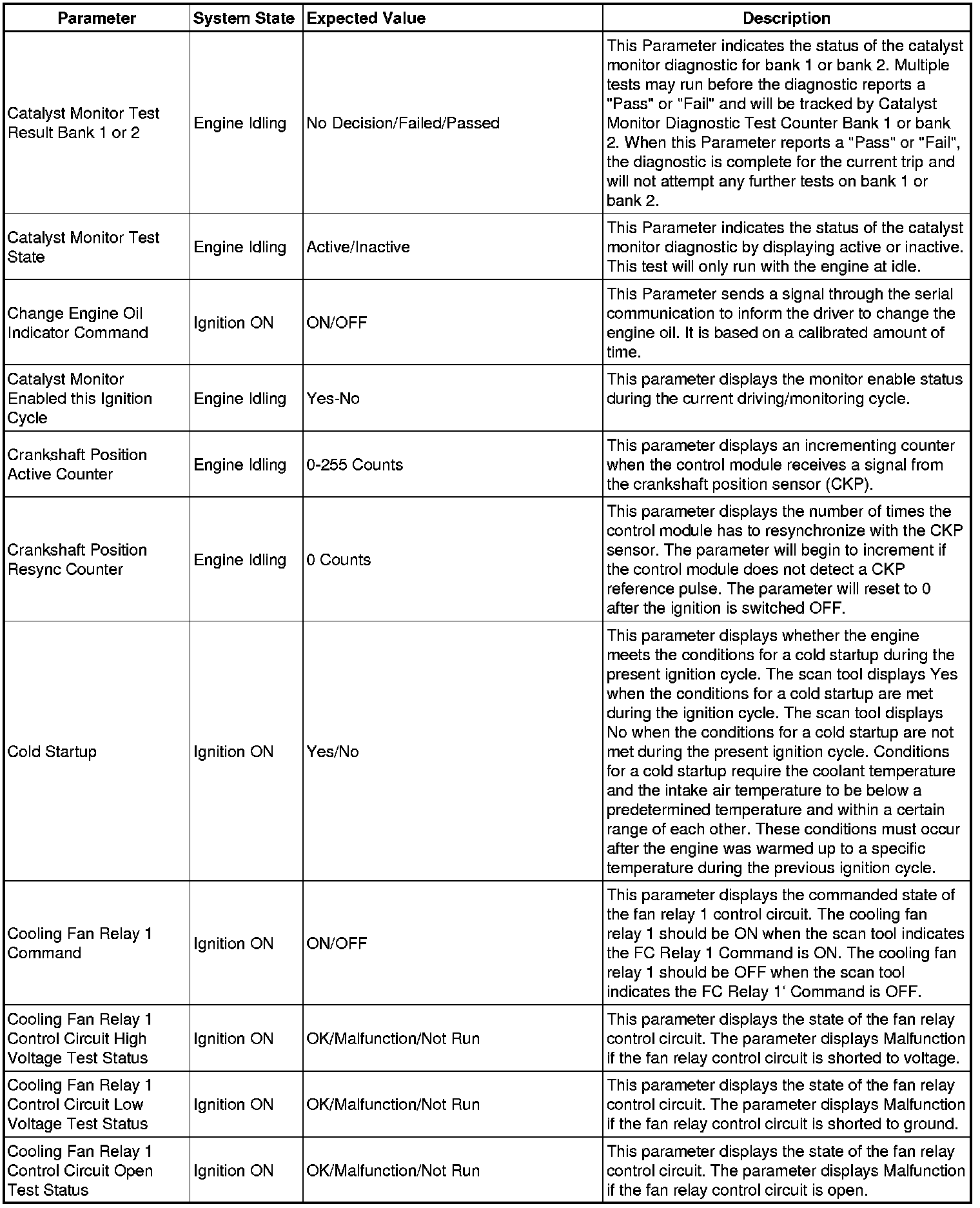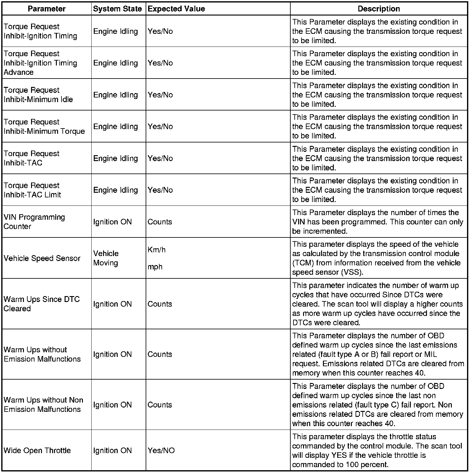 Only the parameters listed below are referenced in this service manual for use in diagnosis.