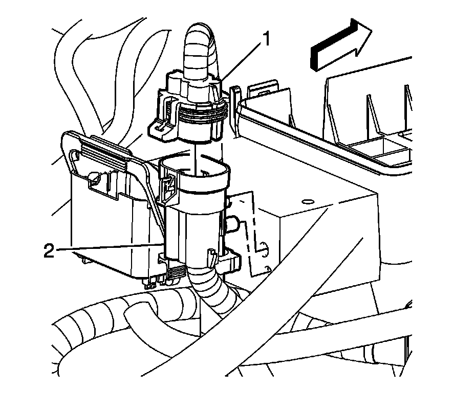 1. Disconnect the auxiliary fluid pump electrical wire harness connector (1) from the auxiliary fluid pump control module connector (2).