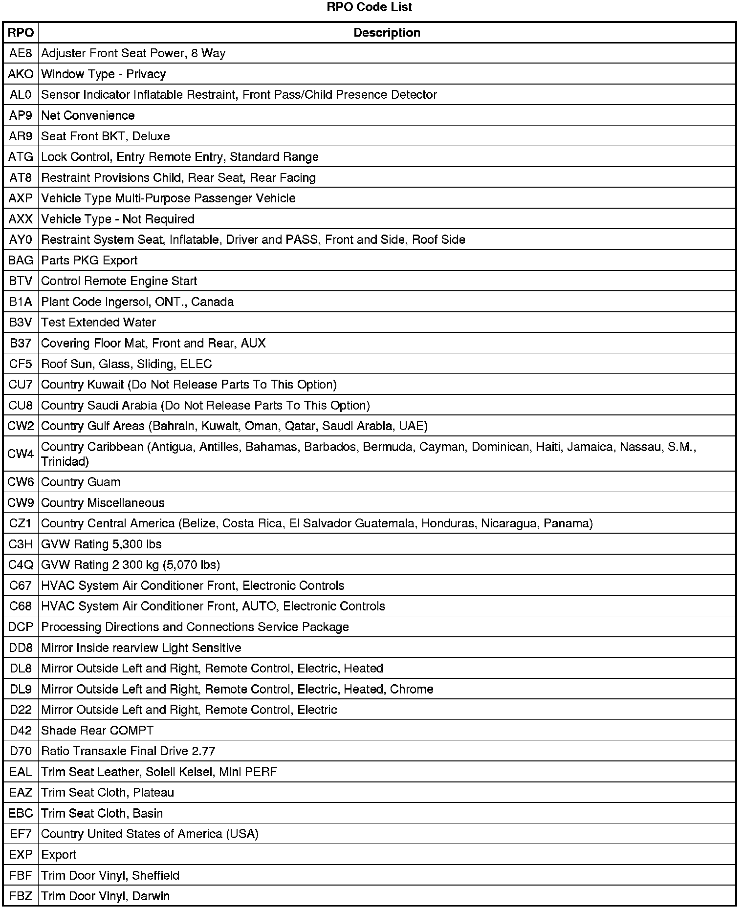 RPO Code List