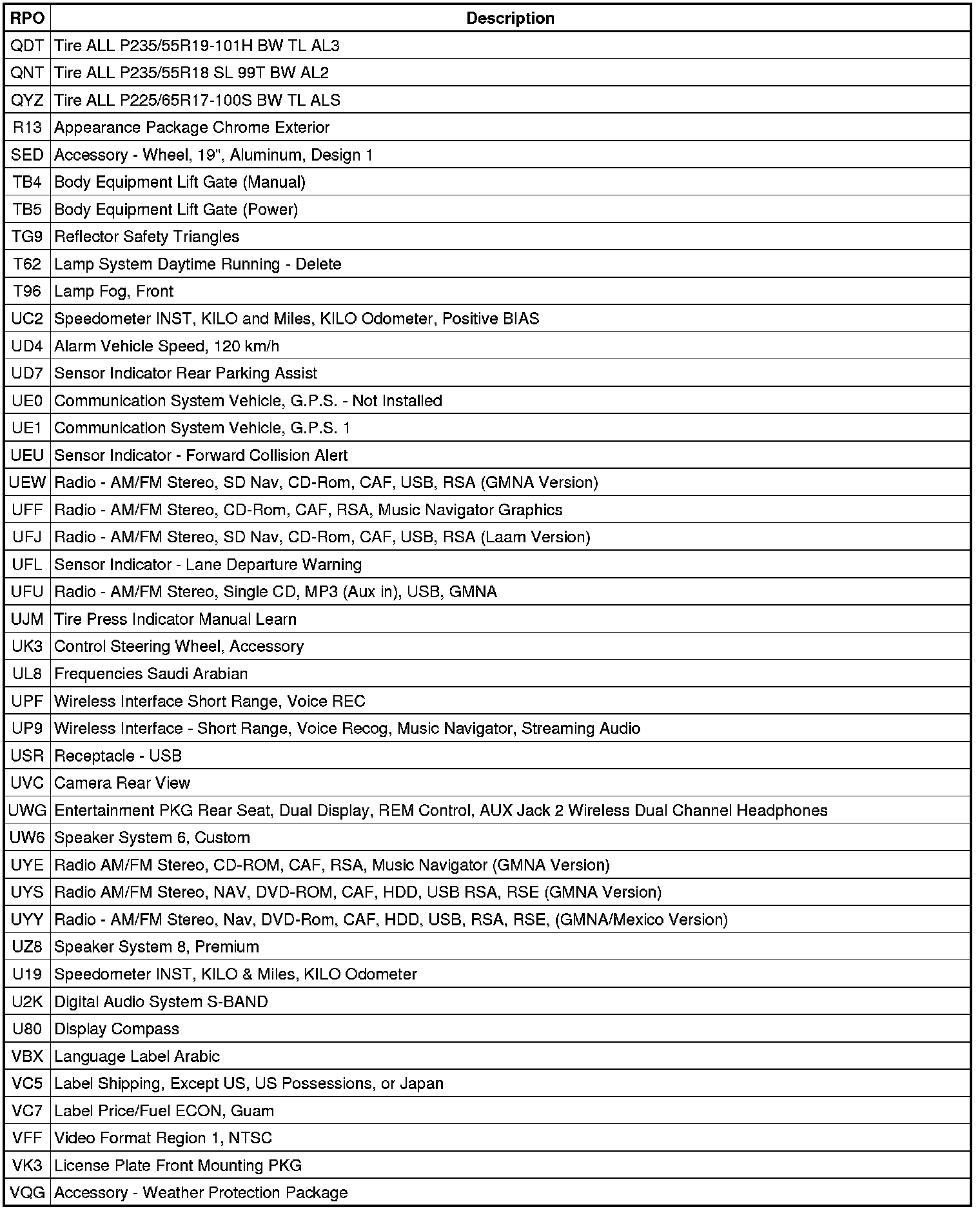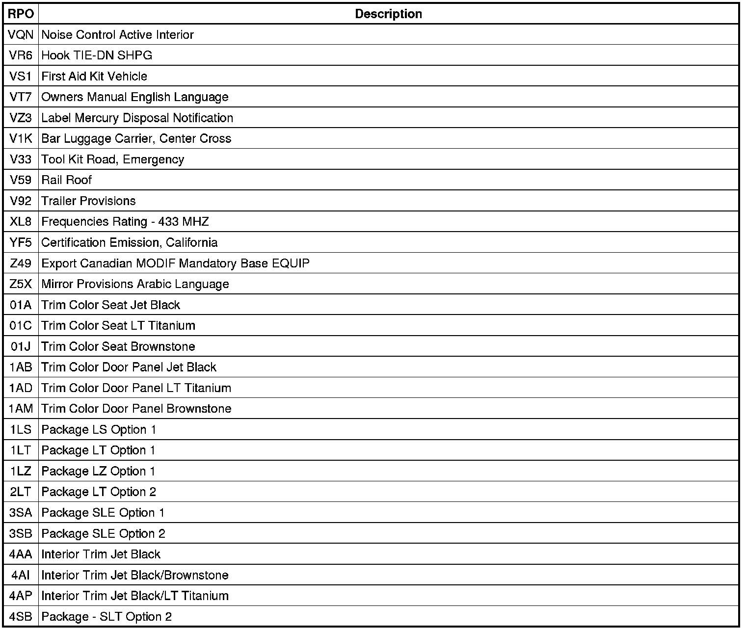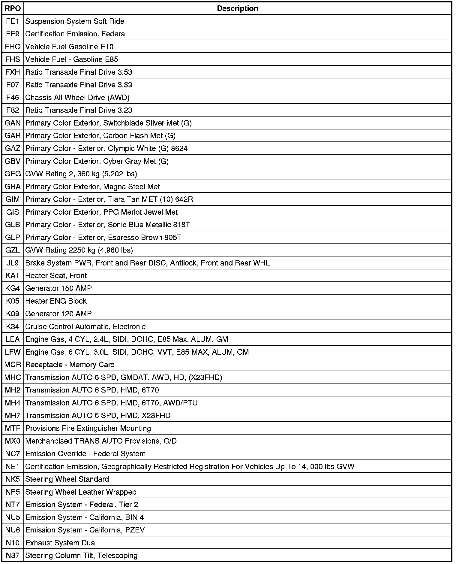 The following table provides the description of the RPO codes that are available on the vehicle. The vehicles RPO list is printed on the Service Parts Identification Label.