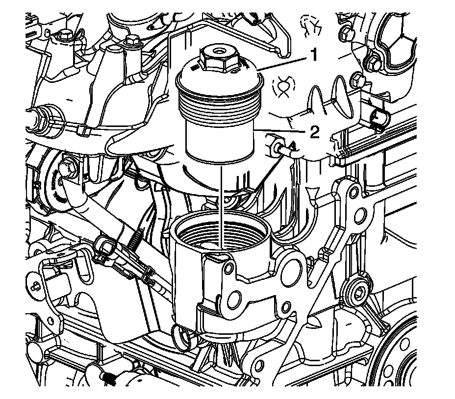 5. Use EN-44887 - wrench to Install a NEW oil filter (2) and a NEW seal and tighten the oil filter cap (1) to 22 Nm (16 lb ft).