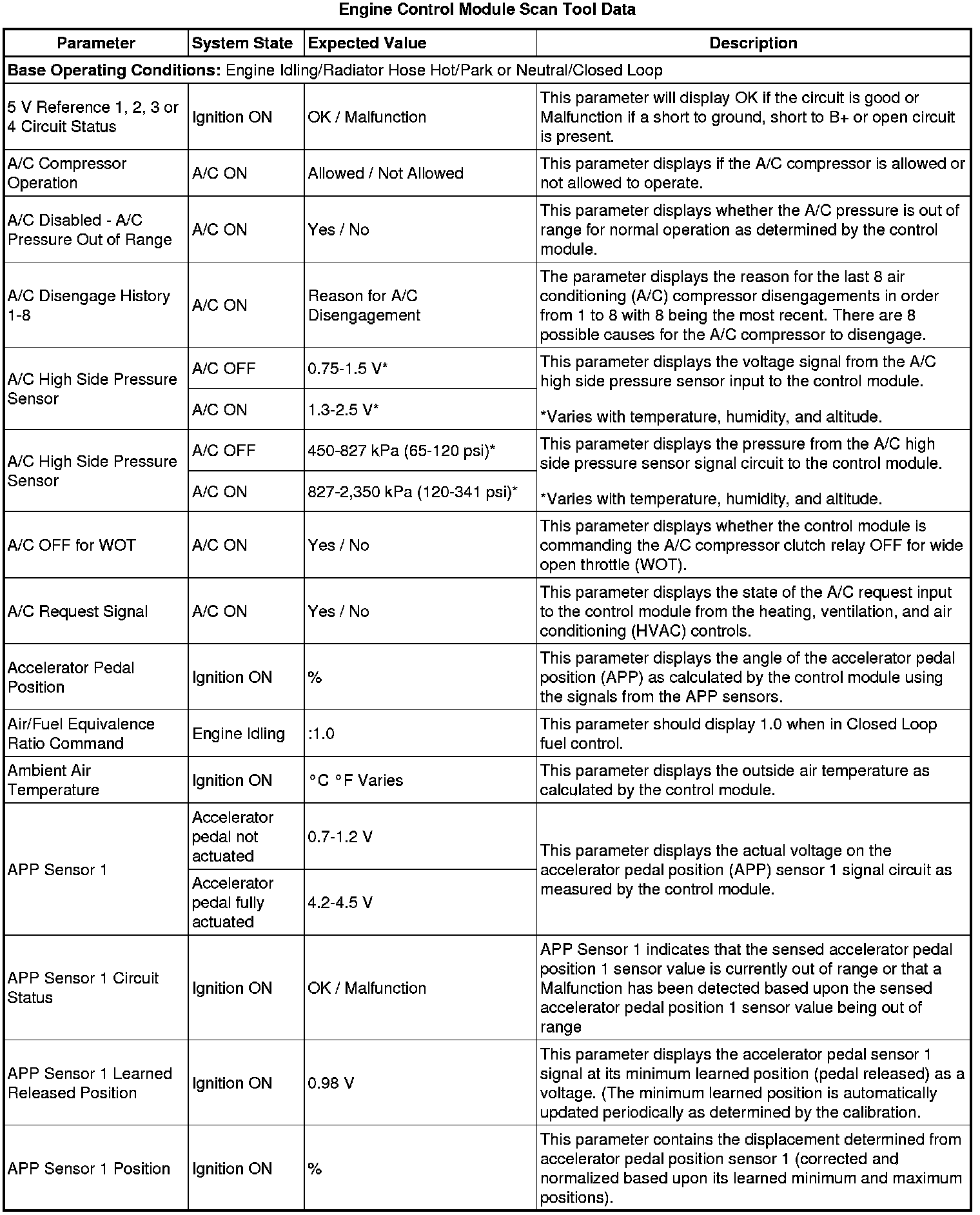 The Engine Control Module Scan Tool Data List contains all engine-related parameters that are available on the scan tool. The list is arranged in alphabetical order. A given parameter may appear in any one of the data lists, and in some cases may appear more than once, or in more than one data list in order to group certain related parameters together.