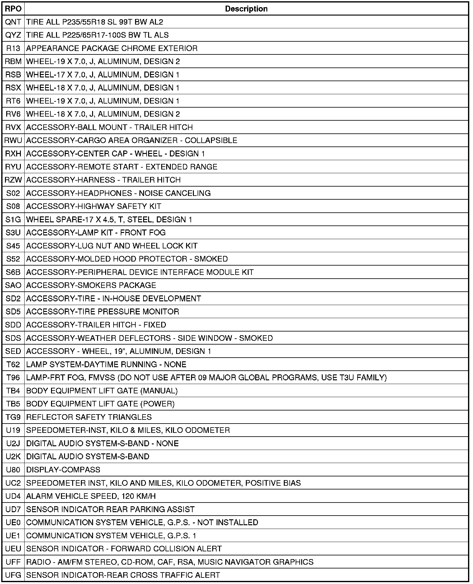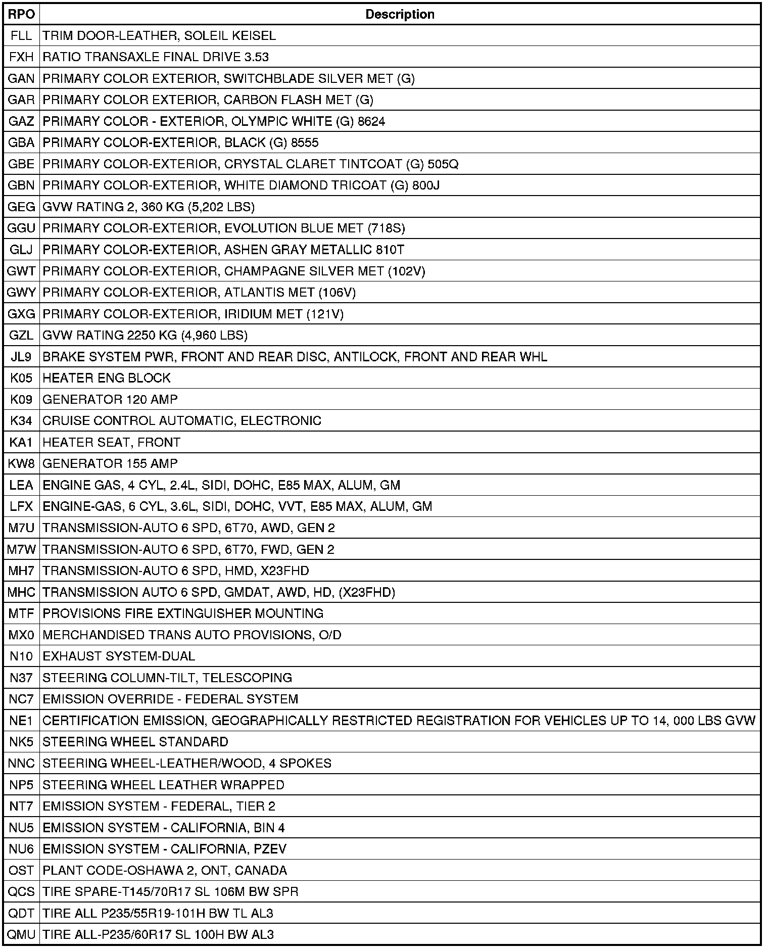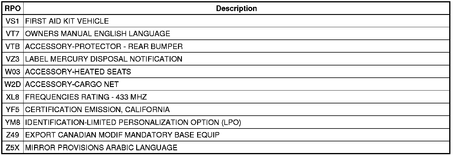 The following table provides the description of the RPO codes that are available on the vehicle. The vehicles RPO list is printed on the Service Parts Identification Label.