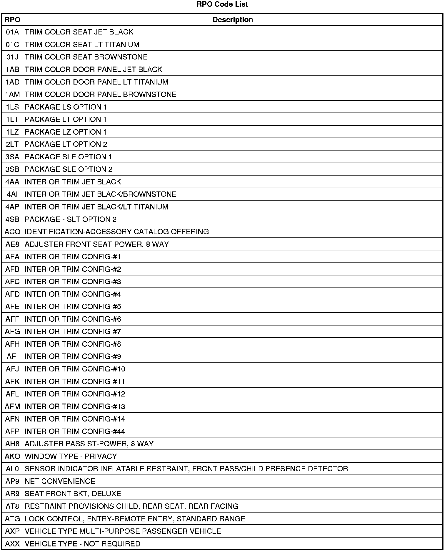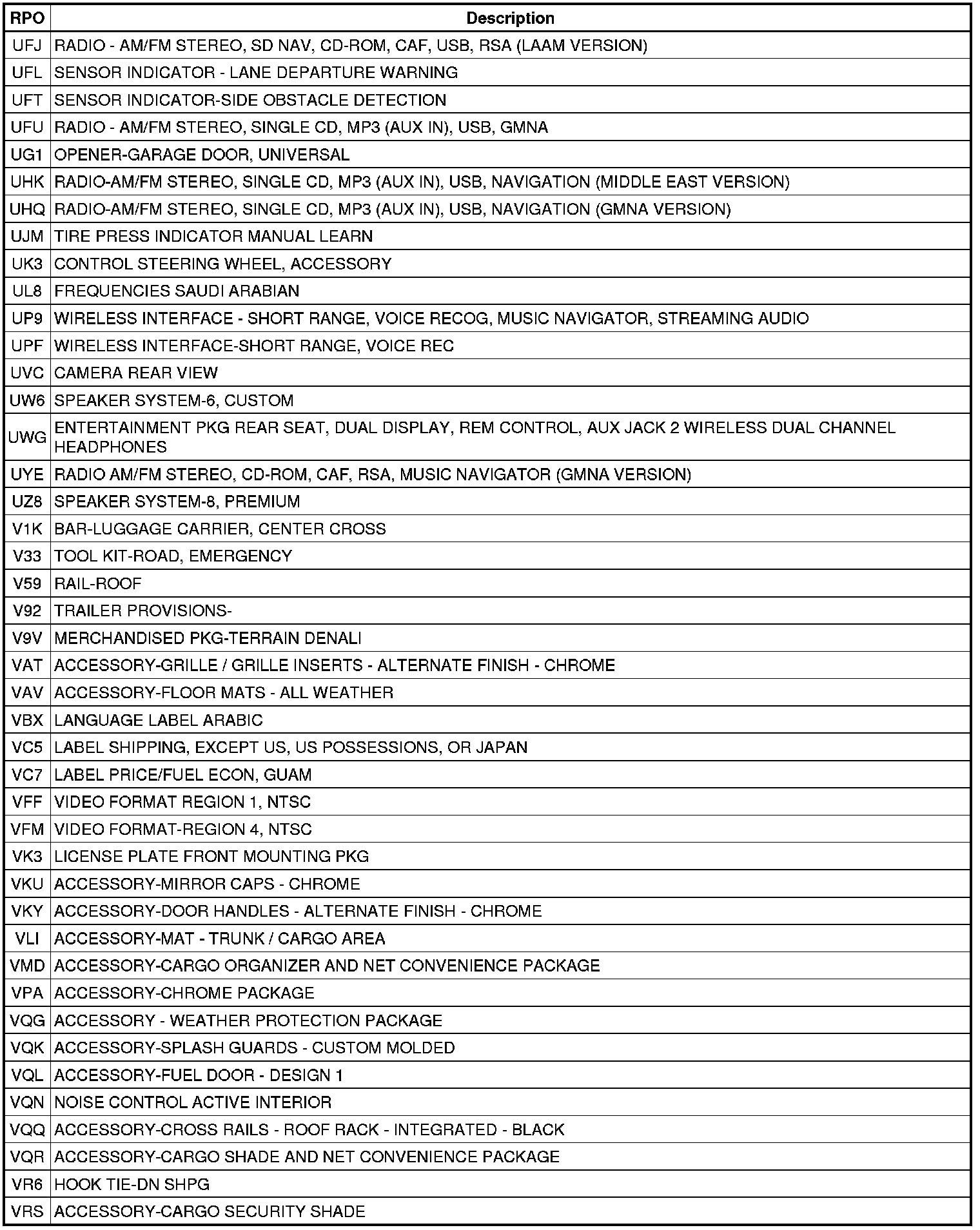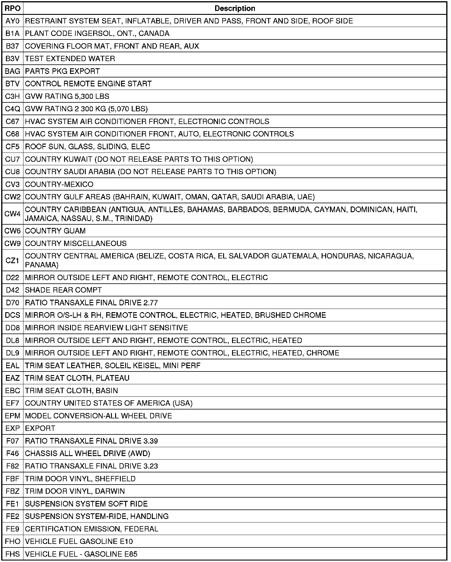 The following table provides the description of the RPO codes that are available on the vehicle. The vehicles RPO list is printed on the Service Parts Identification Label.
