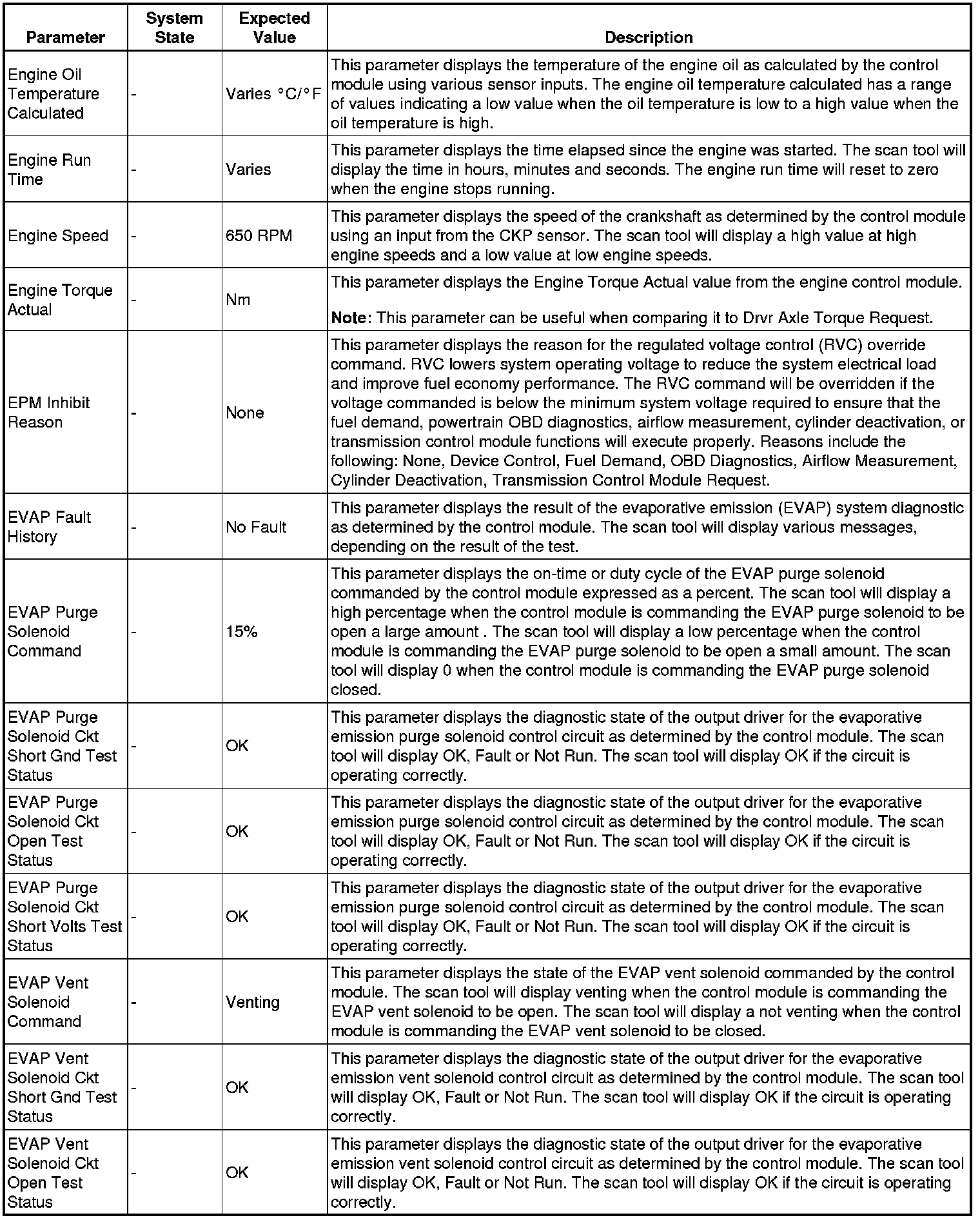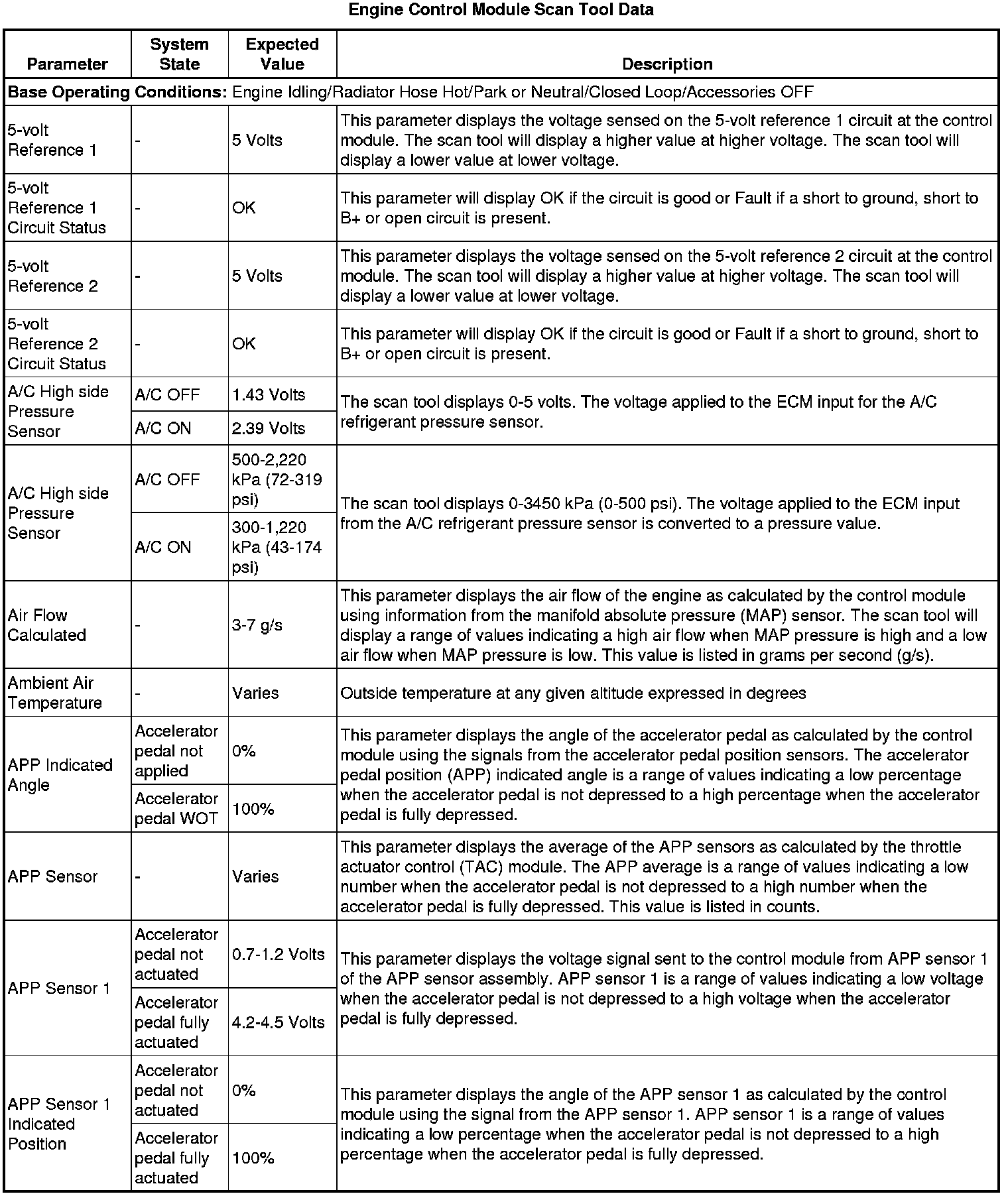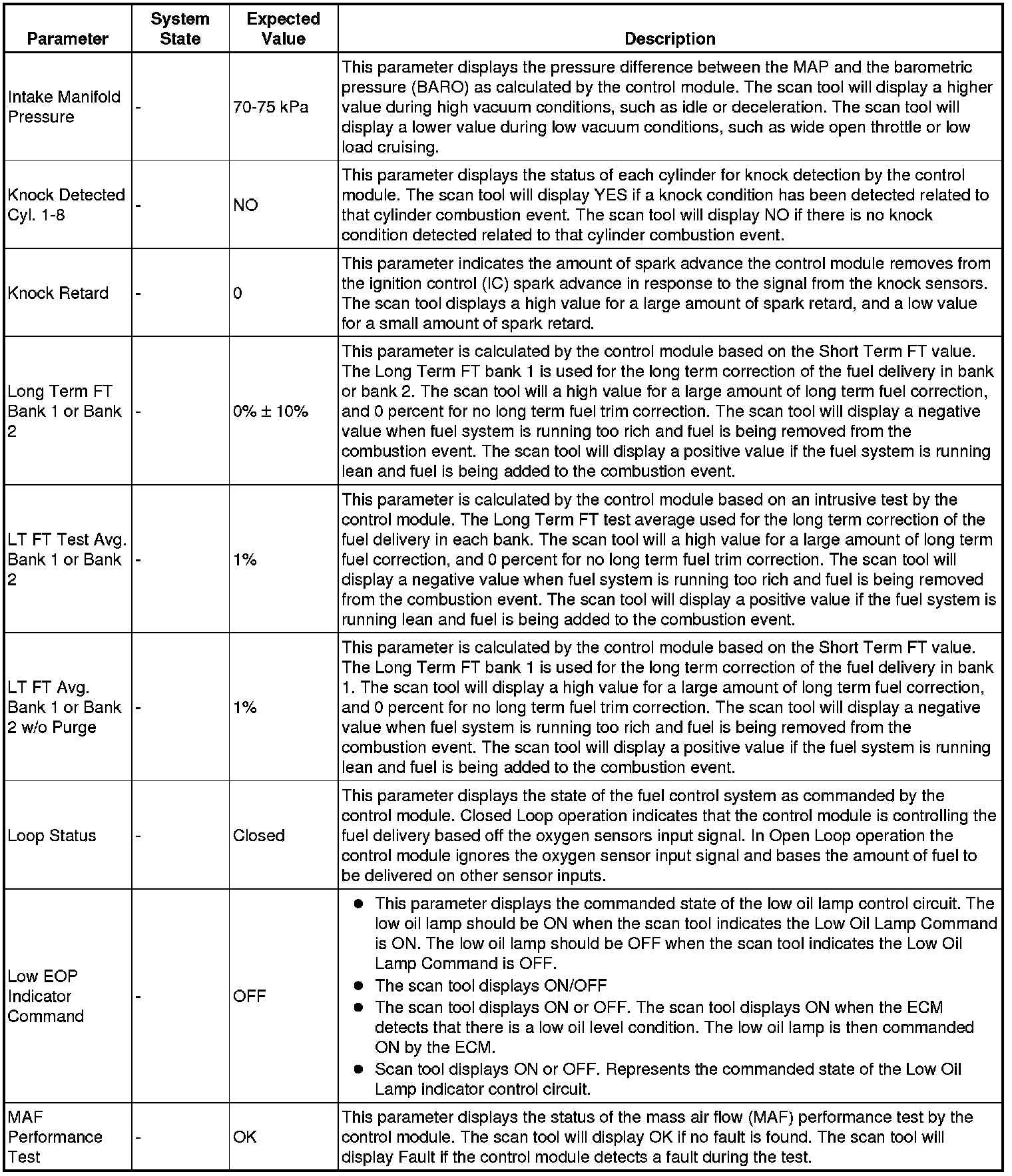 The scan tool values from a properly running engine may be used for comparison with the engine you are diagnosing. The engine scan tool data list represents values that would be seen on a normally running engine.