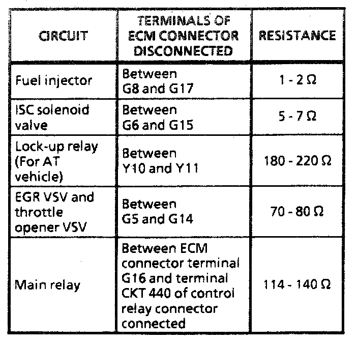 Home >> Geo >> 1991 >> Tracker 4x2 L4-1590cc 1.6L >> Repair and Diagnosis >> Specifications >> Electrical Specifications >> Engine Control Module >> ECM Circuit Resistance Check
