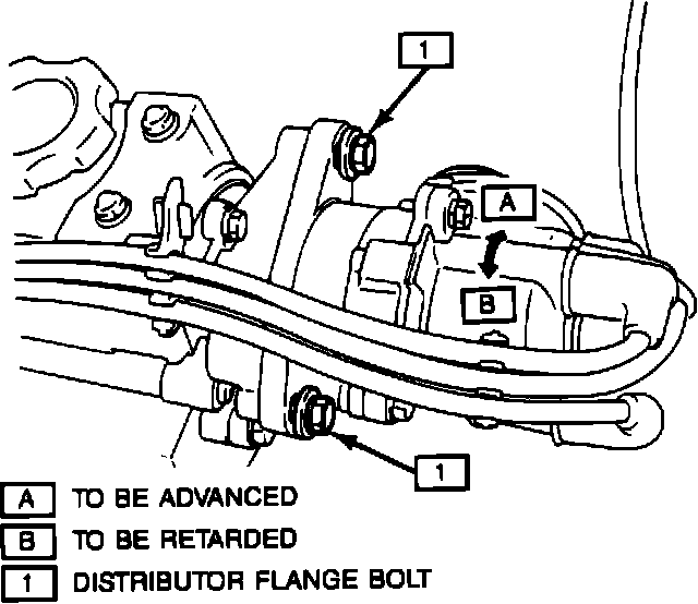 10. If not within specifications, loosen distributor flange bolts and rotate distributor and repeat until timing is within specifications.