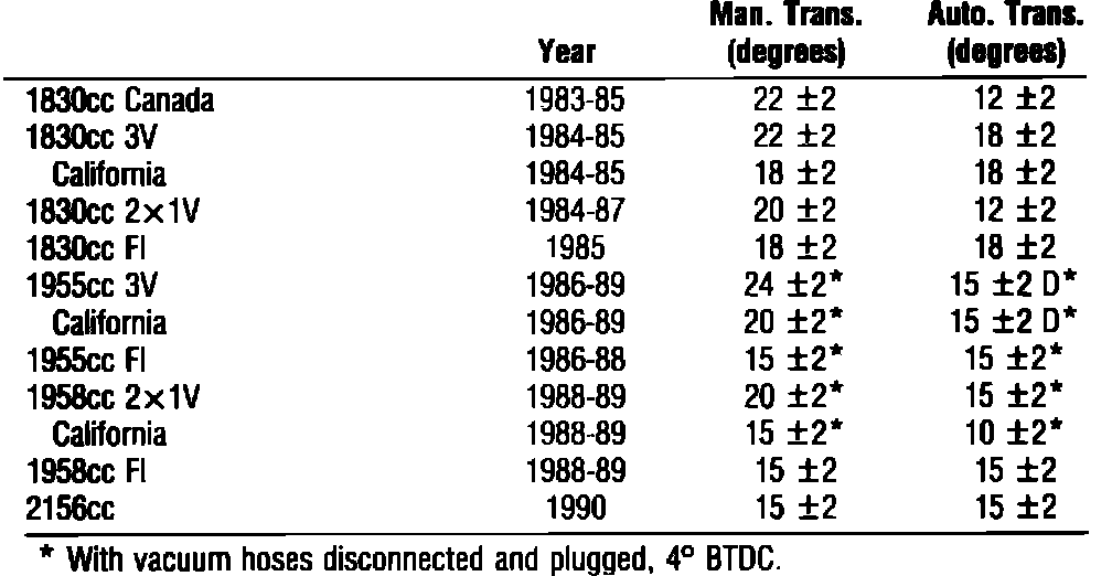 Manual Transmission: 20° ± 2° BTDC (Red) at 800 ± 50 rpm in neutral.