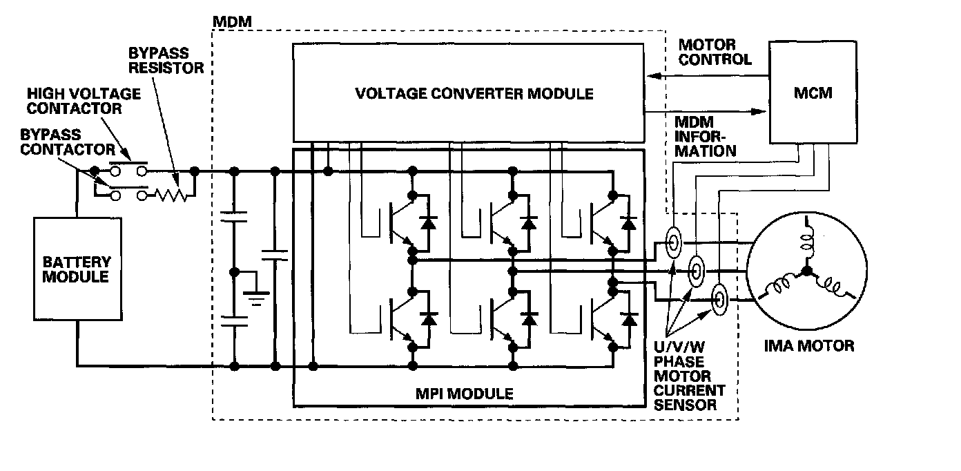 The MDM consists of the MPI module, voltage converter module, capacitor, and the U/V/W phase motor current sensors. The voltage converter acts as a preamplifier for the IGBTs. The IGBTs are used to transfer electrical energy to the motor from the 144 V battery and vice versa. The IGBTs are activated by the MCM based on the amount of assist/regeneration is needed. The voltage converter module monitors voltage and temperature of the MDM, and sends this information to the MCM.