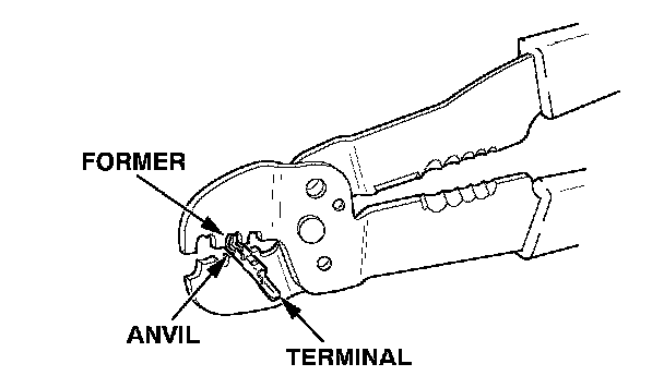 4. Position the terminal in the crimping tool slot with the solid portion of the terminal toward the anvil and the open section toward the former.