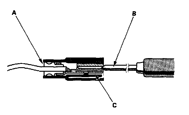 3. If you cannot get to the wire side of the connector or the wire side is sealed (A), disconnect the connector and touch the tester probe (B) to terminals (C) from the terminal side. Do not force the probe into the connector.