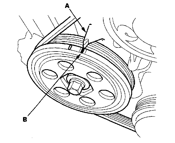 6. Aim the light toward the pointer (A) on the oil pump. Check the ignition timing under a no load conditions; headlights, blower fan, rear window defogger, and air conditioning are not operating. If the ignition timing differs from the specification below, replace the engine control module (ECM).