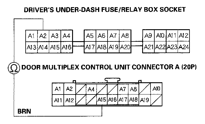 4. Check for continuity between No.2 terminal of the driver's under-dash fuse/relay box socket and No.15 terminal of the door multiplex control unit connector A (20P).