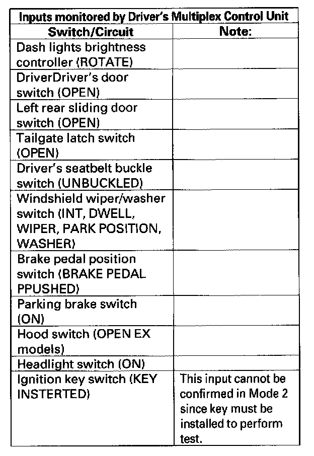 Mode 2 is an easy way to identify a problem circuit without having to test circuit with a DVOM Mode 2 will confirm a switch/circuit is working by flashing the ignition key light and sounding the beeper as the circuit is used. The multiplex control system will confirm inputs as they are grounded except for the following circuits.