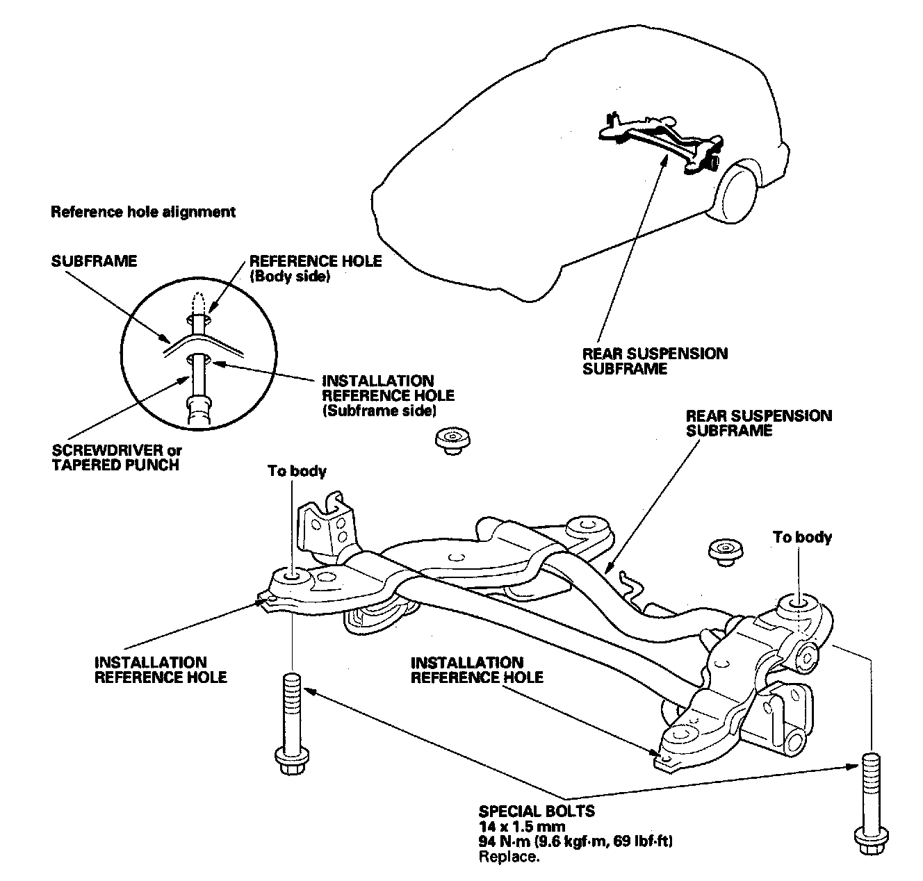 After removing the subframe mounting bolts, be sure to replace them with new ones.
