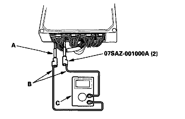 1. Connect the backprobe adapters (A) to the stacking patch cords (B), and connect the cords to a digital multimeter (C).