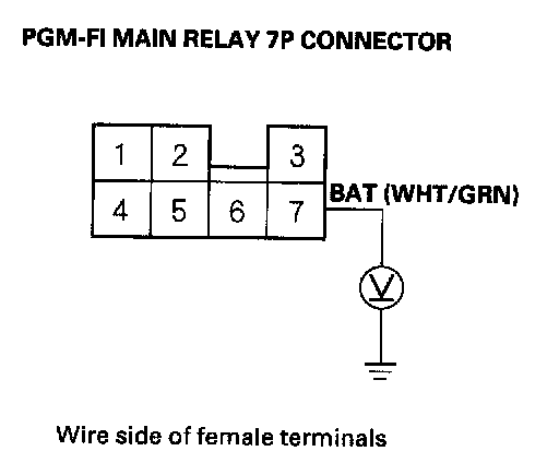1. Turn the ignition switch OFF, then disconnect the PGM-FI main relay 7P connector.