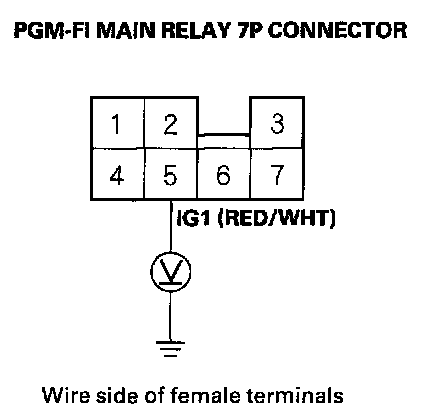 5. Turn the ignition switch ON (II), and measure voltage between body ground and the PGM-FI main relay 7P connector terminal No.5.