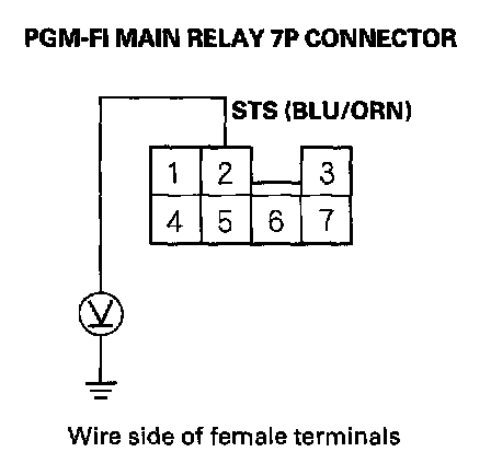 7. Shift to Park, then turn the ignition switch to the START (III) position, and measure voltage between body ground and the PGM-FI main relay 7P connector terminal No.2.
