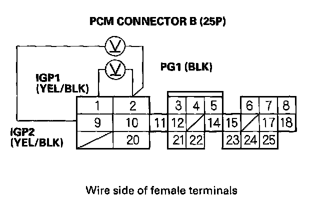 12. Turn the ignition switch ON (II), and measure voltage between the PCM connector terminals B1 and B2, and between B9 and B2.