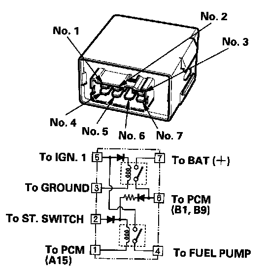 15. Connect battery power to the PGM-FI main relay 7P connector terminal No.2 and connect ground to the PGM-FI main relay 7P connector terminal No.1. Then check for continuity between the PGM-FI main relay 7P connector terminals No.5 and No.4.